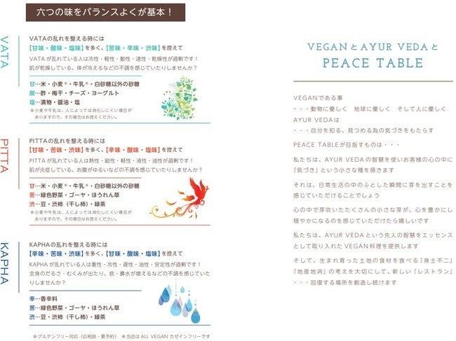 「PEACE TABLE」は近年健康法として注目を集めているインドの伝統医学・アーユルヴェーダを取り入れ、入店後に行うパーソナルチェックの結果をもとに、個人の体質や体調に合わせたメニューを提案する、日本初のパーソナルヴィーガンレストランです。