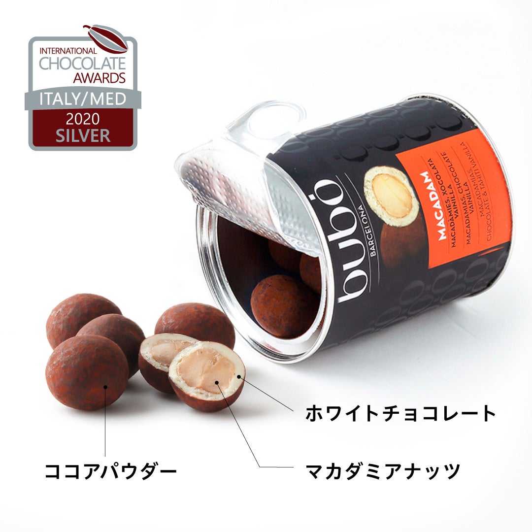 大粒のナッツをチョコレートでコーティングした、bubó BARCELONA定番のチョコフルーツコレクション。大粒のマカダミアナッツを、バニラの香り立つホワイトチョコレートでコーティングし、ココアパウダーで仕上げました。海塩がアクセントのホワイトチョコレートと、香ばしいマカダミアナッツが、絶妙なハーモニーを奏でます。満足感のある一粒は、やみつきになる逸品です。