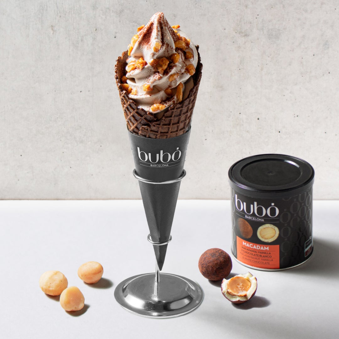 ブボ・バルセロナを代表するチョコレート「チョコフルーツ マカダム」フレーバーのオリジナルソフトクリーム。バニラの豊かな香り立つミルキーなソフトクリームに、キャラメリゼした香ばしいマカダミアナッツ、コクのあるマカダミアソース、アクセントに塩味をプラス。マカダミアナッツのカリッとした食感、甘さを引き立てる絶妙な塩味、豊潤なバニラの味わいが口の中で見事に調和し、忘れられない至福のひとときをお届けします。ブボ・バルセロナ自慢の味わいをお楽しみください。