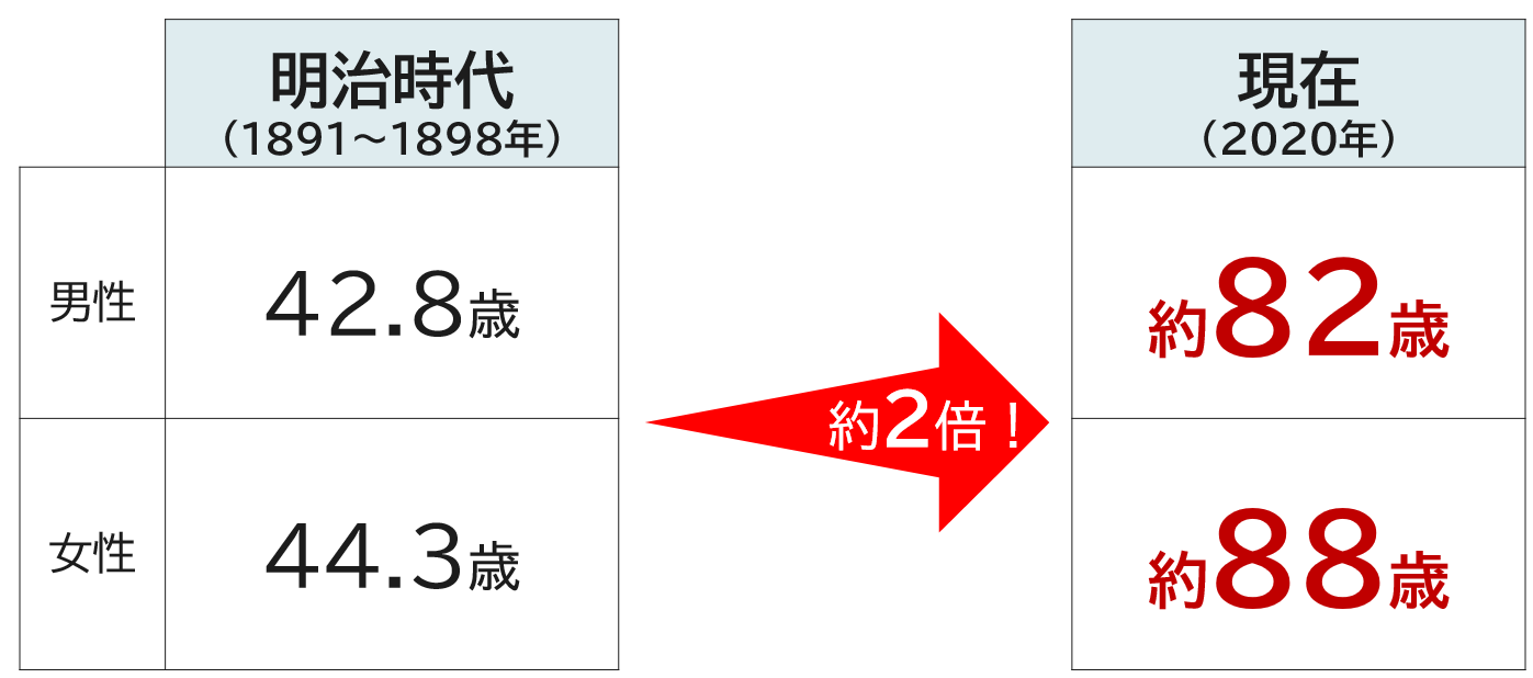 金融リテラシーの必要性が高まってきている背景として、日本の長寿化があげられます。過去の調査結果をみると、1891~1898年(明治24~31年)の平均寿命は、男性が42.8歳、女性が44.3歳でした(年度に幅があるのは、公表数値が複数年の平均値であるためです)。明治時代の平均寿命は50歳にも満たなかったわけです。しかしその後、平均寿命は延びていき2020年には男性が約82歳、女性が約88歳となりました【図表1】。
