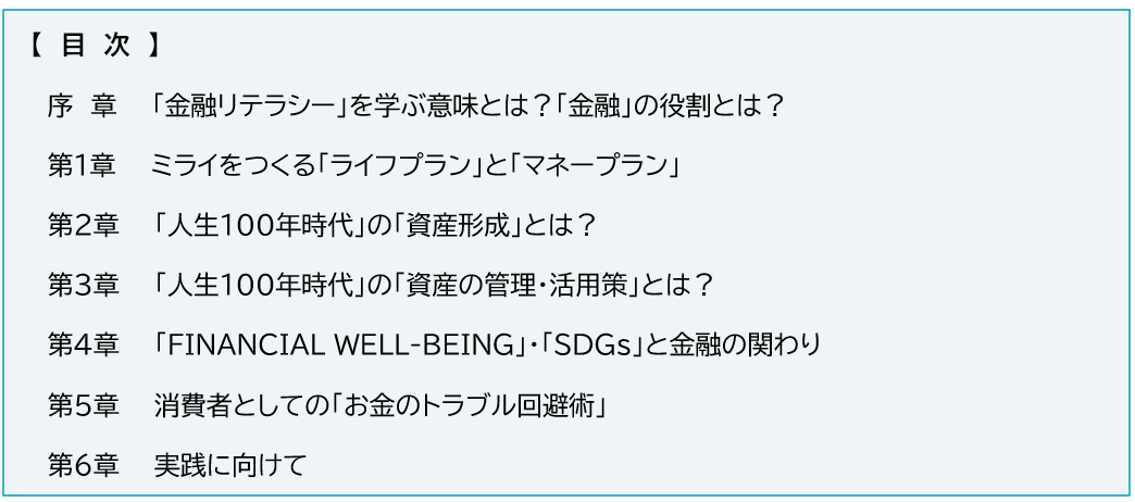 学校で「金融教育」について学ぶ高校生のみなさま、指導される教諭のみなさまはもちろんのこと、人生100年時代における自分らしいミライを実現したいと考えているみなさま、それを支援するファイナンシャル・プランナーや企業・団体等の人事関連部署のみなさまにも、是非ご一読いただきたい内容になっています。
