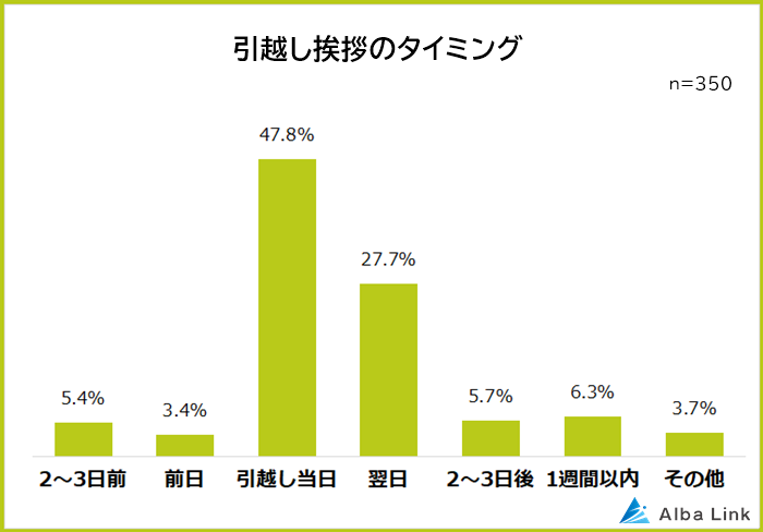「挨拶のタイミング」で最も多かったのは「引越し当日(47.8%)」で、全体の半数近くにのぼりました。次いで多いのが「翌日(27.7%)」となっています。