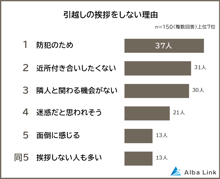 引越しの挨拶をしない150人に理由を聞いたところ、1位は「防犯のため(37人)」でした。2位「近所付き合いしたくない(31人)」、3位「隣人と関わる機会がない(30人)」と続きます。