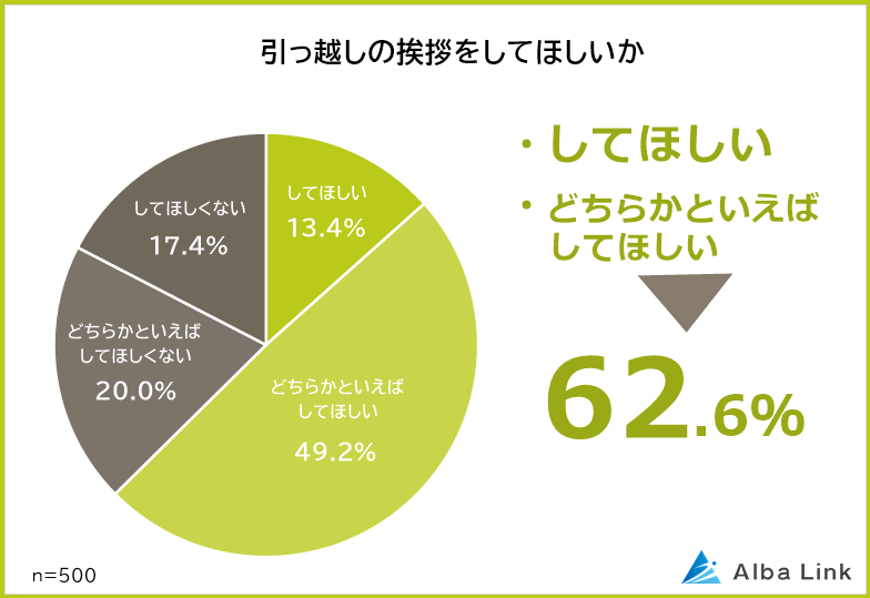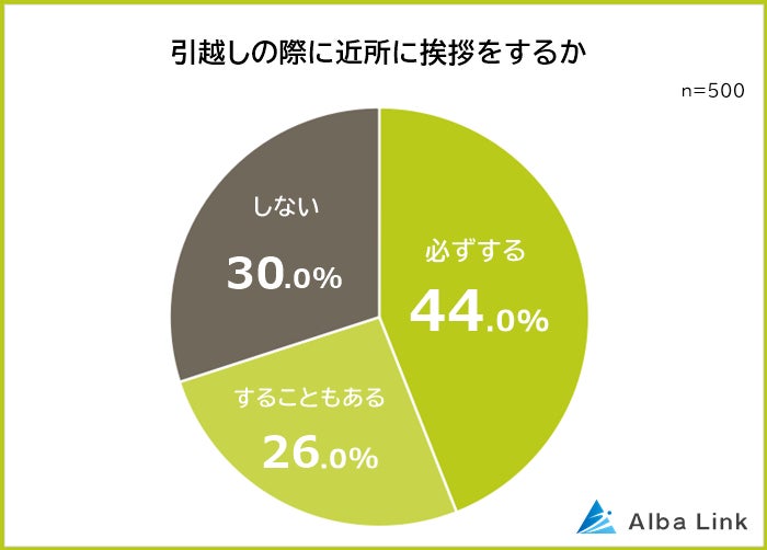 今回、株式会社AlbaLink( https://albalink.co.jp/ )が運営する訳あり物件買取ナビ( https://albalink.co.jp/realestate/ )は、引越しをしたことがある男女500人を対象に「引越しの挨拶」についてアンケート調査を実施しました。