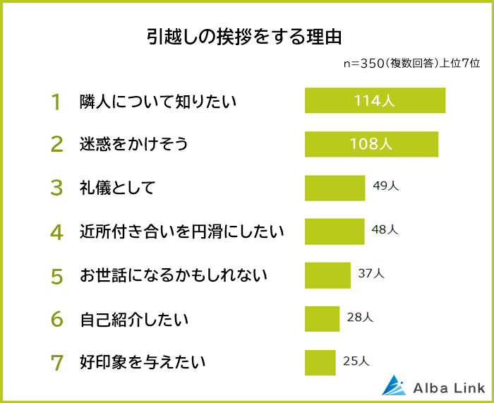 続いて、引越しの挨拶をすると回答した350人に「挨拶をする理由」を聞きました。その結果、1位は「隣人について知りたい(114人)」でした。