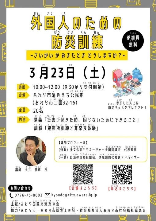 あわら国際交流友の会では、外国人の方や外国人の方を雇用する企業の人事担当者等を対象に、防災イベント「外国人のための防災訓練」を実施します。