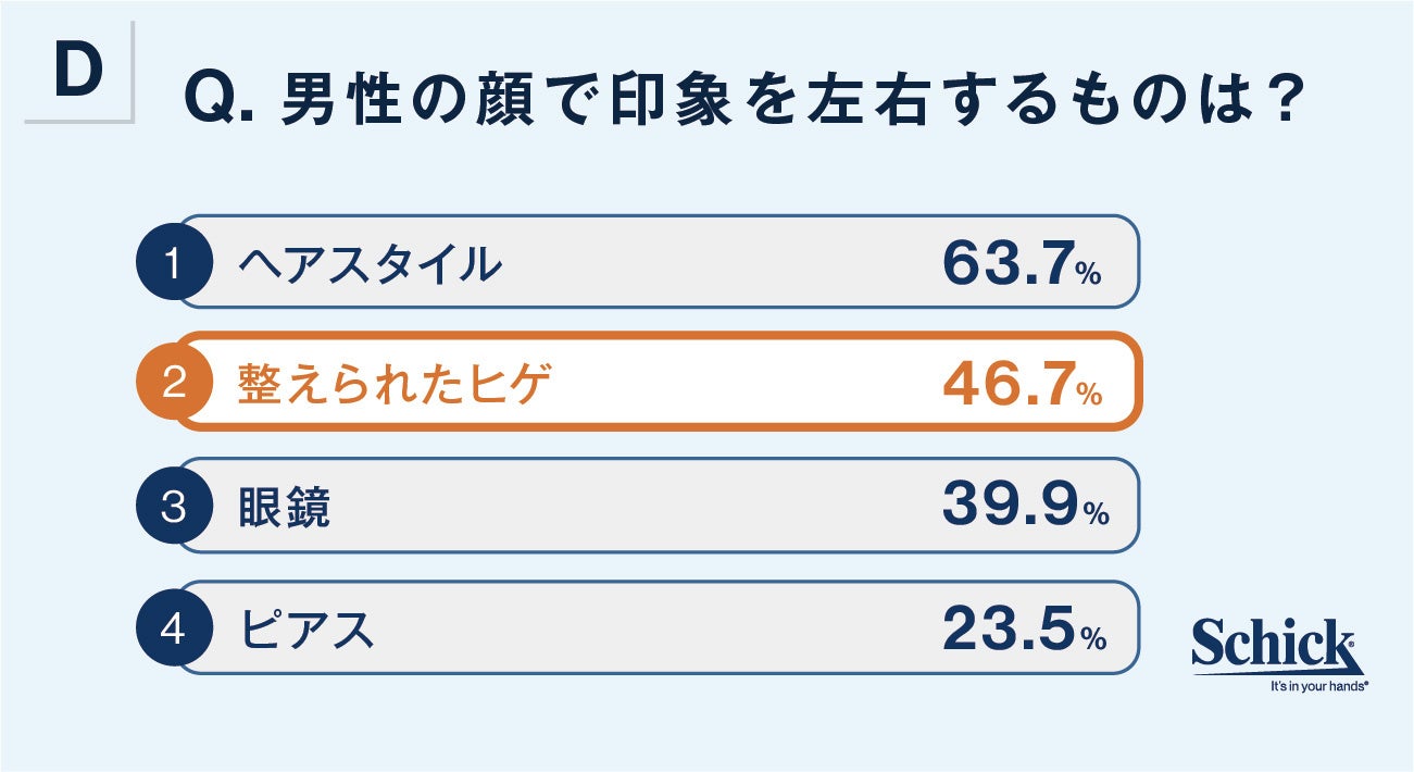 男女871人を対象にした調査(※3)では、男性の顔の中で「印象を左右する(複数回答可)」のは「整えられたヒゲ」と46.7%が回答。代表的なファッションアイテムともいえる「メガネ」(39.9%)、「ピアス」(23.5%)を抑える結果になりました。ヘアスタイルの次に「印象に残る」という結果に、ヒゲもファッションアイテムの1つとして定着し始めてきたと考えられます。