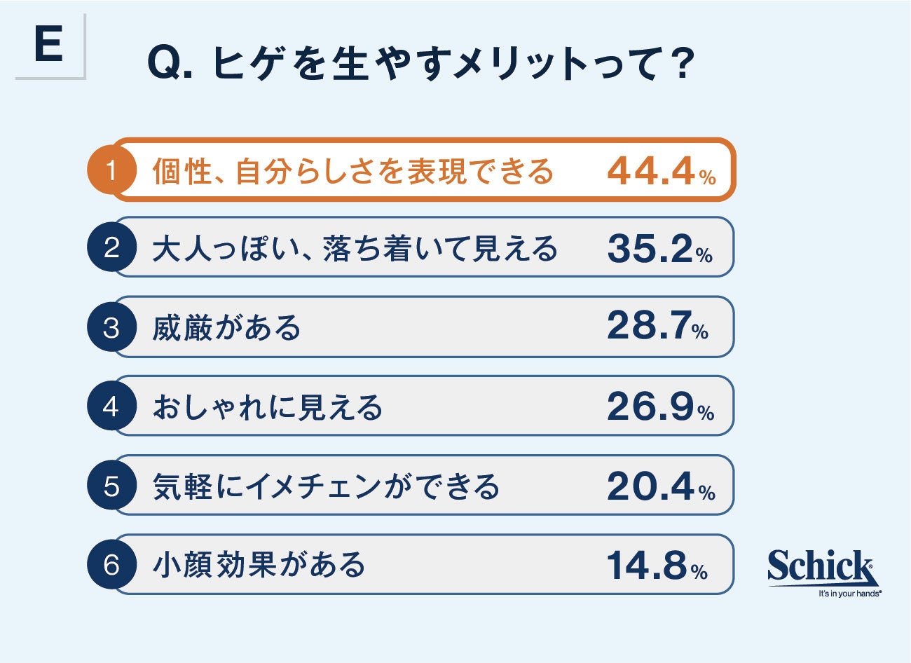 ヒゲを生やしている人にとっての「ヒゲを生やすメリット(複数回答可)」は、「個性・自分らしさを表現できる」(44.4%)がもっとも多く、ヒゲが個性と自分らしさを表現するファッションとして活用されていることがわかりました。続いて、「大人っぽい、落ち着いて見える」(35.2%)「威厳がある」(28.7%)「おしゃれに見える」(26.9%)が上位という結果に。ほかにも、「イメチェンができる」や「小顔効果」など、オシャレ度を気軽にアップできる「ヒゲの効果」に期待する声が上がっています。この結果から、ヒゲを生やす方は様々な理由でこだわりを持った個性的なヒゲスタイルを楽しんでいることが読み取れるのではないでしょうか。