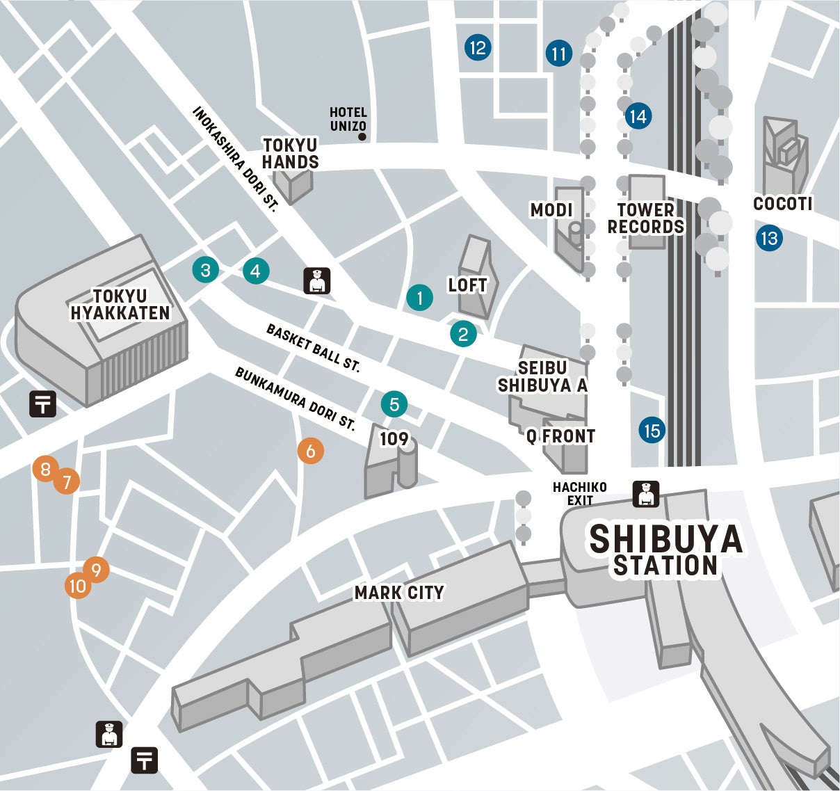 ⓫IDOビル ⓬神南プラザビル ⓭PRONTO 渋谷宮下公園店 ⓮ファイヤーストリートボード ⓯第一榮来ビル