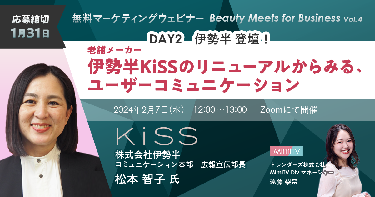 「ヒロインメイク」や「ヘビーローテーション」を手掛ける株式会社伊勢半が、「KiSS」ブランドのリニューアルの際、ユーザーコミュニケーションに注力し、その主戦場にSNSを選択した理由について、株式会社伊勢半の松本氏をゲストに迎え、その背景とMimiTVでの取り組み事例をトークセッション形式で解説します。