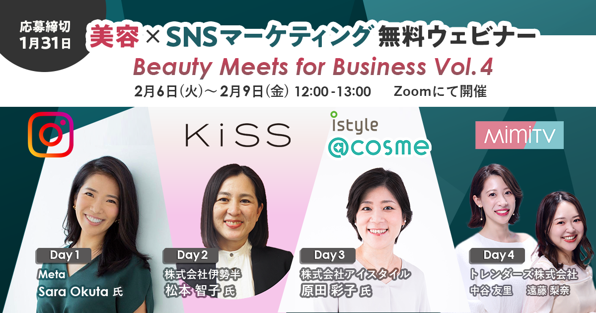 このたび、美容商材のマーケティングに携わる方に向けた無料マーケティングウェビナー「Beauty Meets for Business~美容マーケティングの今とこれから~」の第4回の開催が決定いたしました。