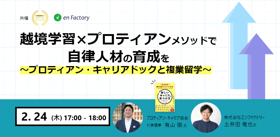 組織と個人のより良き関係性構築と個人の主体的なキャリア開発を支援する一般社団法人プロティアン・キャリア協会 (東京都新宿区、代表理事:田中研之輔・有山徹、以下、「当協会」)は、提携先の株式会社エンファクトリー(東京都渋谷区、代表取締役社長CEO加藤健太、以下、「エンファクトリー」)とプロティアン研修と越境学習を組み合わせた「越境キャリア自律支援プログラム」の提供を2月より開始いたします。提供開始に先立ち2月24日に記念セミナーを開催いたします。https://protean20220224.peatix.com/