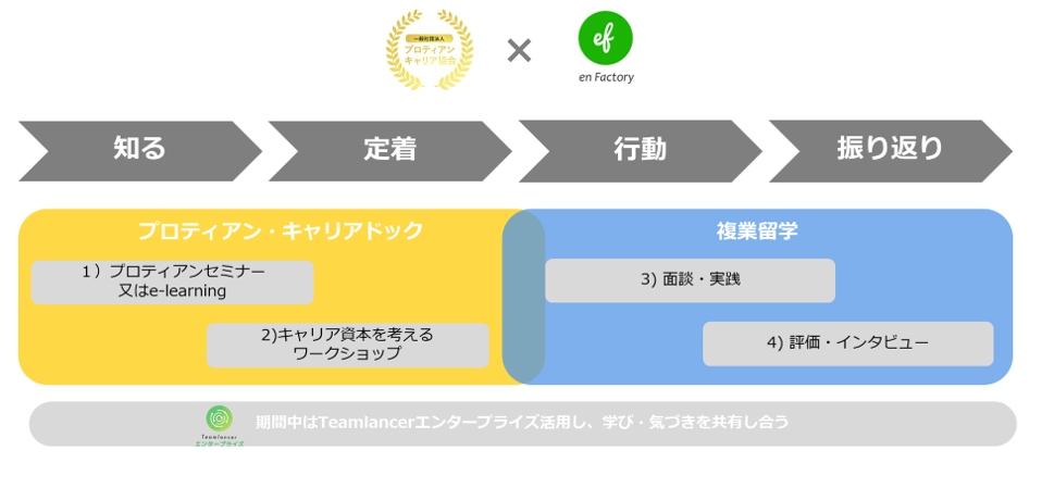 この度、当協会がキャリア自律に向けた行動変容支援のための総合的なプログラムである「プロティアン・キャリアドック」と業務提携先であるエンファクトリーの越境型研修サービス「複業留学」とを組み合わせることでキャリア自律に向けたキャリア支援プログラムとして提供を開始いたします。