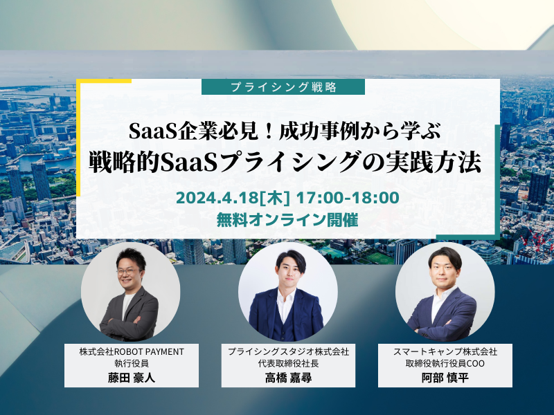 プライシングスタジオ株式会社|4月18日(木)17時~無料共催ウェビナー|SaaS企業必見!成功事例から学ぶ戦略的SaaSプライシングの実践方法