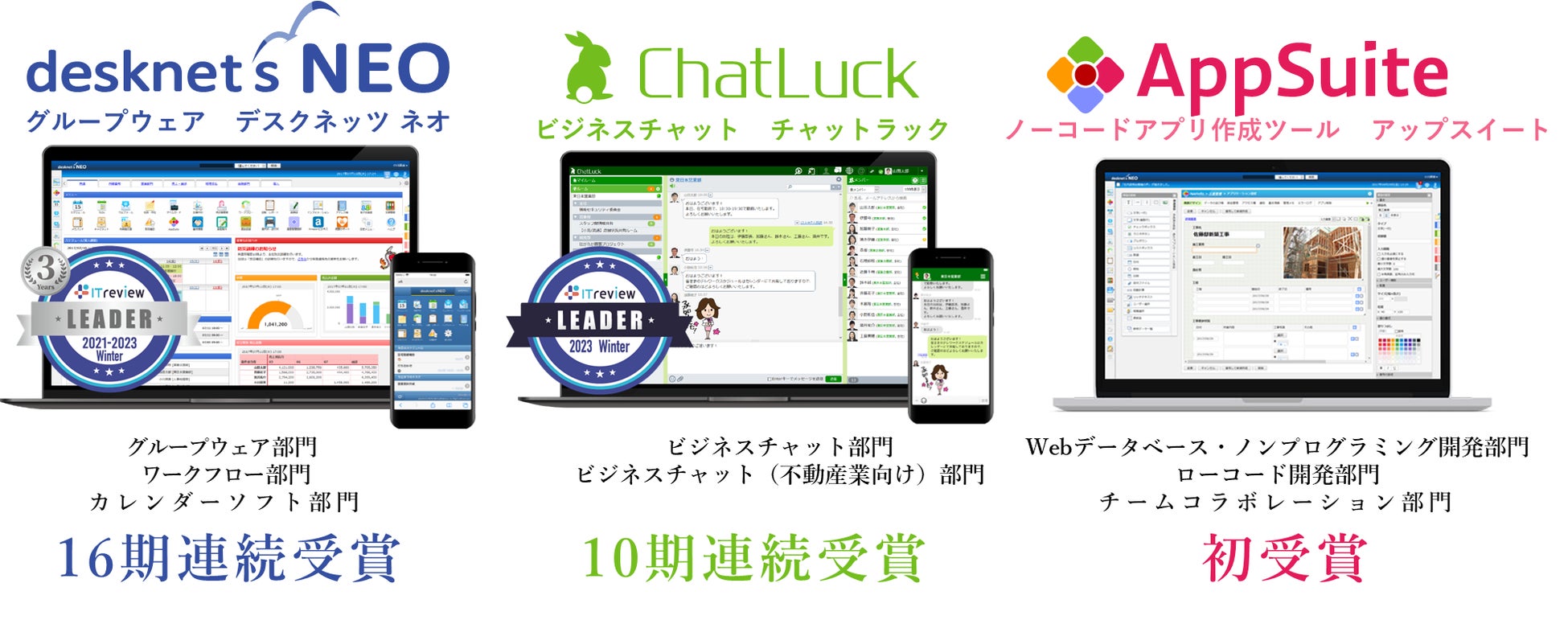 主力3製品、グループウェア『desknet's NEO』・ビジネスチャット『ChatLuck』ノーコードアプリ作成ツール『AppSuite』がそれぞれ受賞