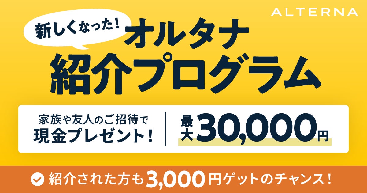 オルタナでは現在、ご紹介された方がオルタナの商品をご購入した場合、ご紹介した方・された方の双方に特典を進呈するプログラムを実施しています。