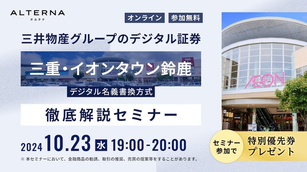 「三井物産グループのデジタル証券~三重・イオンタウン鈴鹿〜(デジタル名義書換方式)」の公開に合わせて、案件の詳細や、商業施設投資について解説するセミナーを開催します。ぜひご参加ください。