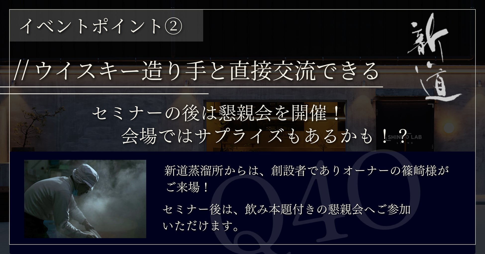 今回のイベントでは、日本酒蔵元としての経験を活かし、情熱あふれるクラフトマンシップを持って、ウイスキーづくりに取り組む造り手の方々と直接交流できる貴重な機会です!また、独創性を追求する新道蒸溜所ならではのこだわり抜いたウイスキーを、解説と共に違いを感じながらテイスティングできます。