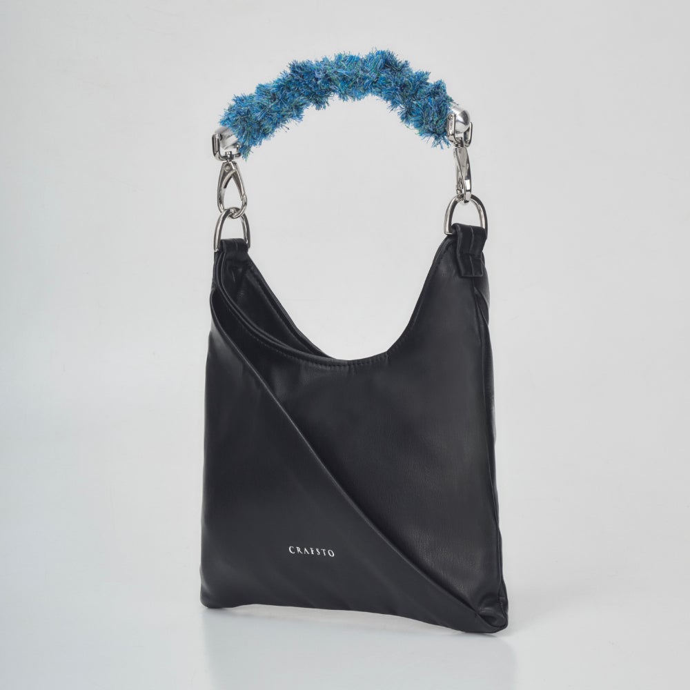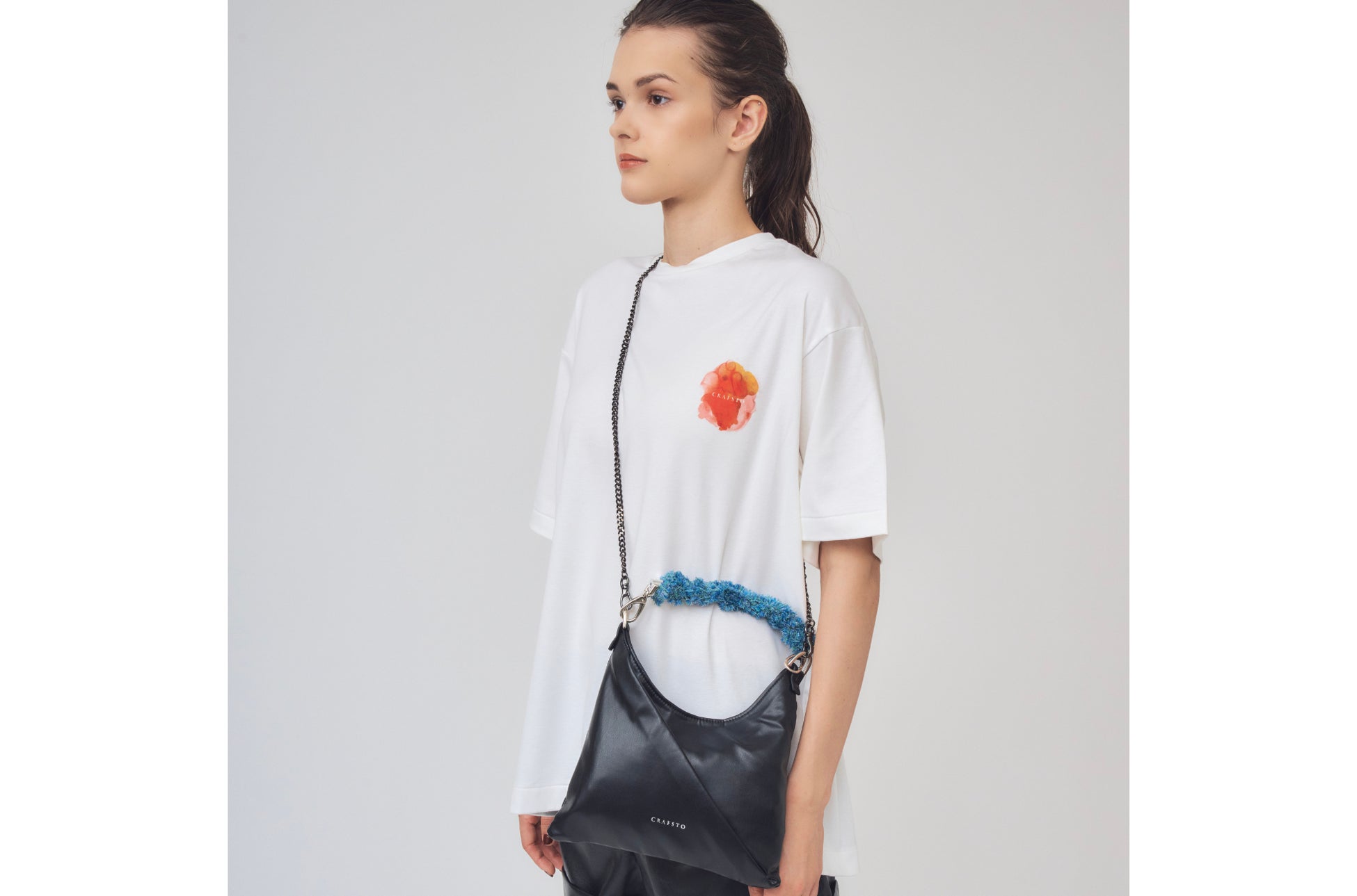 バッグ本体のカラー展開は、ブラックとダークブラウンの2色。ブラックには、ブルー系のオリジナル持ち手。ダークブラウンには、オレンジ系の持ち手がつきます。素材やカラーの組み合わせが目を引くオンリーワンなアップサイクルデザインにより、普段の外出も特別な気持ちにさせてくれます。
