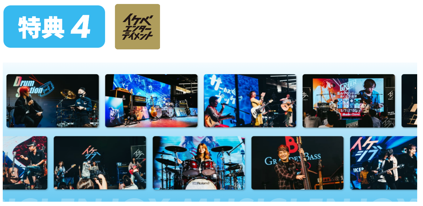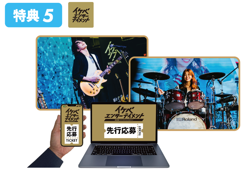 イケベプライム会員は、アーティストやプロミュージシャンが参加するライブやトークなど、イケベ楽器店オリジナルのエンターテイメント・イベントへの先行応募が可能になるほか、会員限定イベントへの参加も可能!
