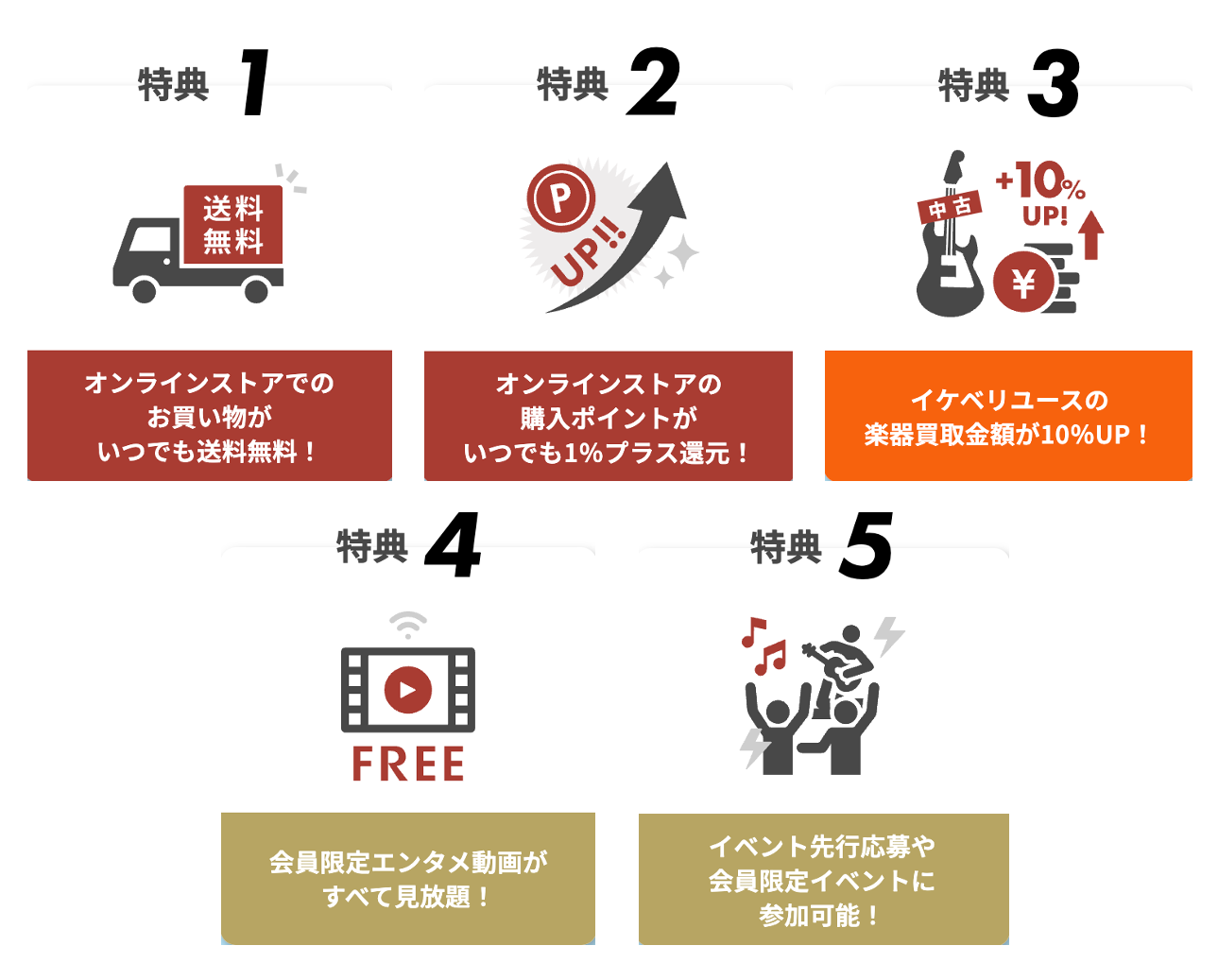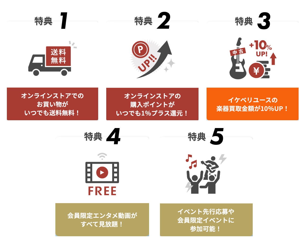 イケベプライムに加入すると嬉しい特典がいっぱい。お買い物や楽器買取、イベントやエンタメ動画などさまざまな特典サービスをお楽しみいただけます。
