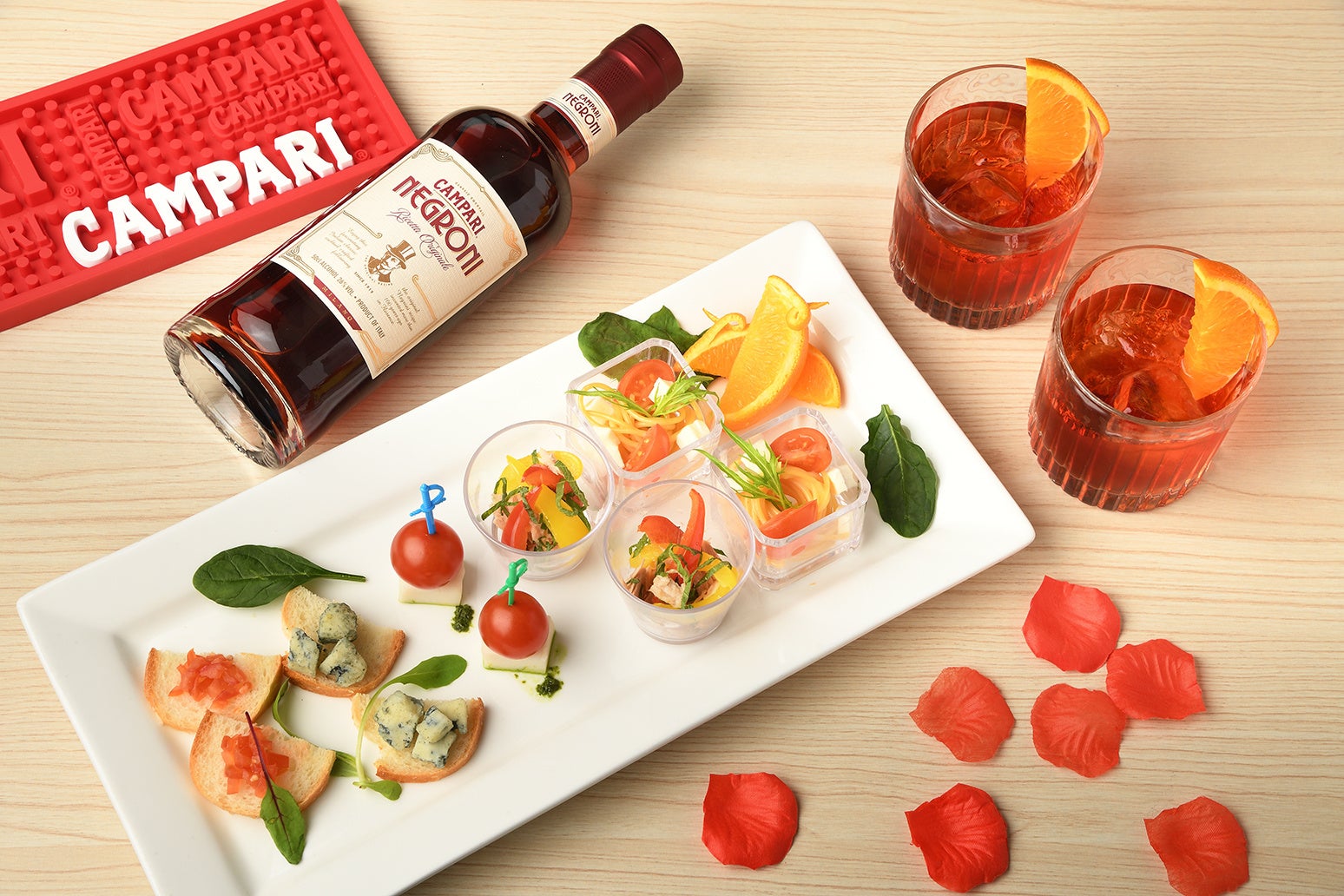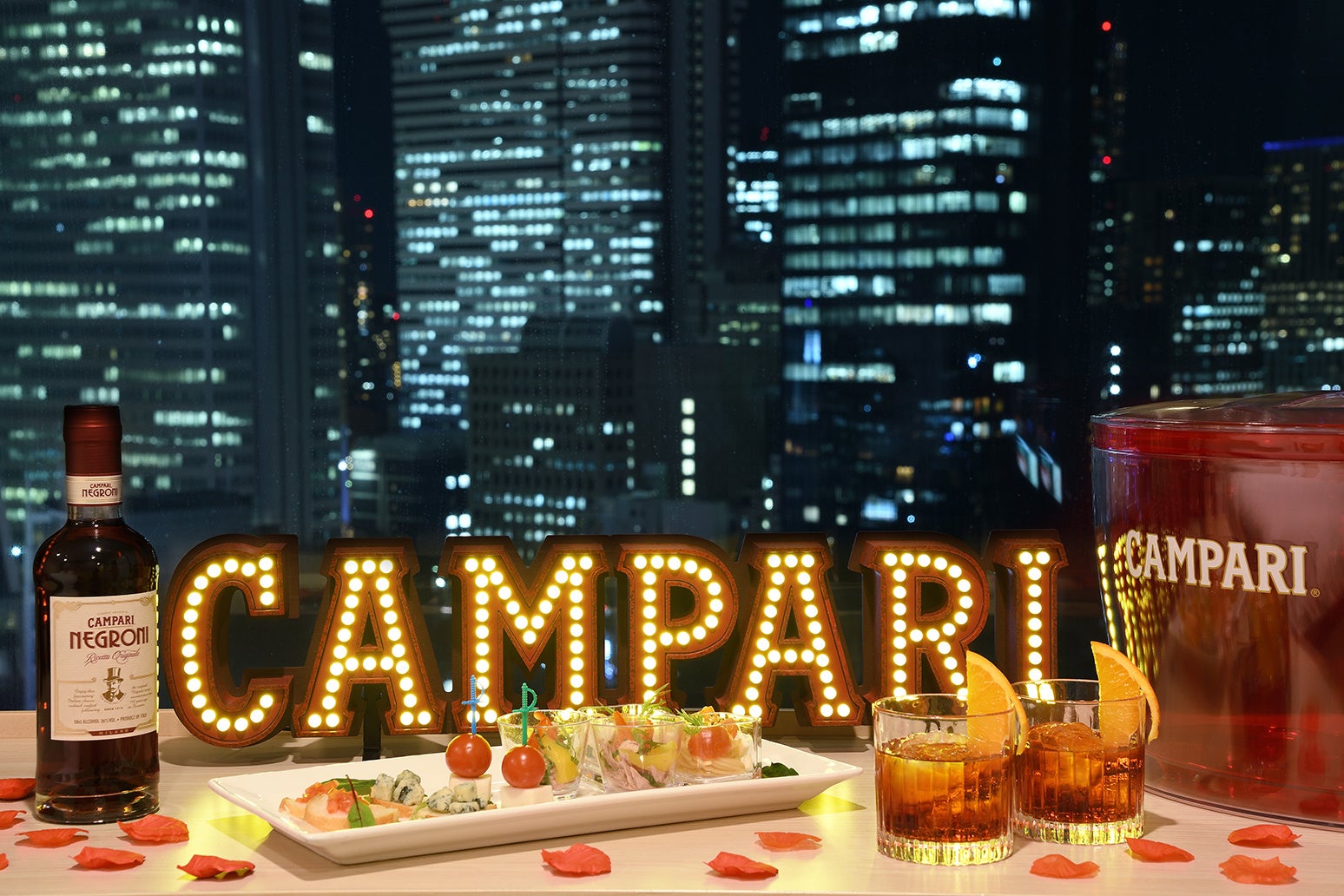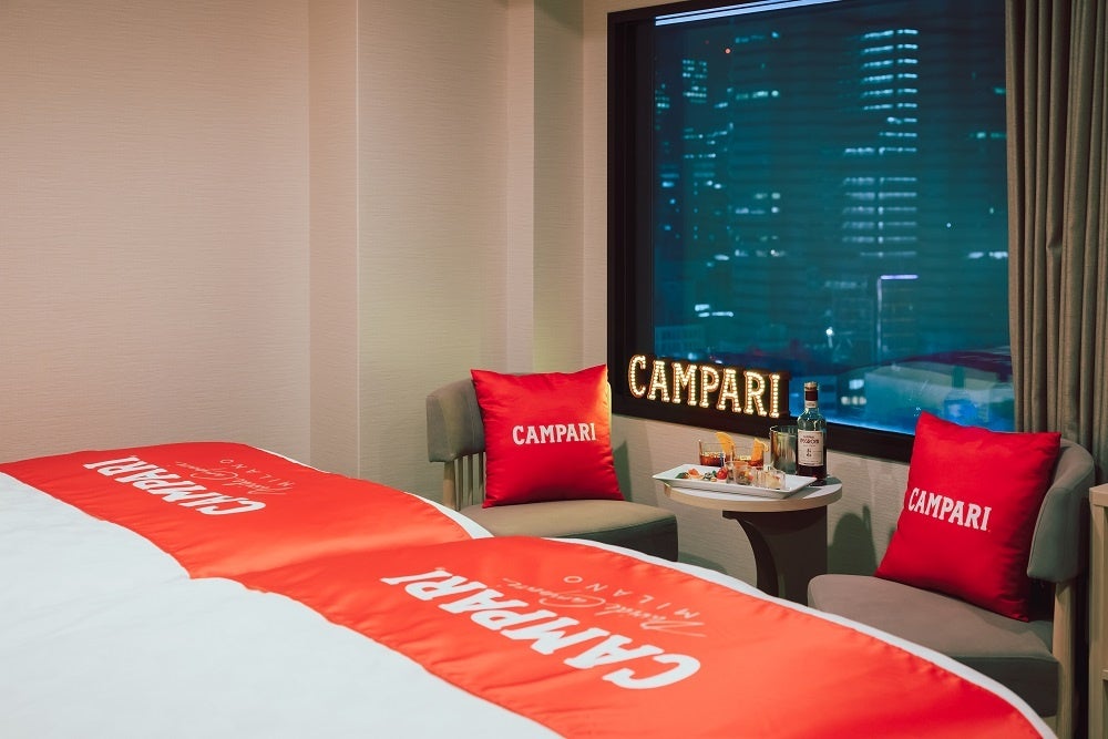 この宿泊プランでは、カンパリの世界観の演出として、ネオン輝くウォールサインやバーマット、カンパリの特徴である赤色のロゴ入りクッションやフットスローをご用意。また、チャバタのカナッペやモッツアレラの冷製カッペリーニなど、イタリアンオードブルを客室へお届けいたします。“カンパリ”らしく赤色で装飾された客室で、ホテルオリジナルオードブルと、カンパリを使った、世界で最も飲まれているカクテル「ネグローニ*」とともに大人なItalian Nightをお楽しみいただけます。夜景が綺麗に見えるこの季節のホテルステイにおすすめのプランです。