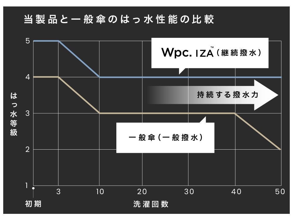※グラフ内容は、傘の通常使用を想定し、傘生地の洗濯試験を3回~50回実施。撥水性能を比較したものです。