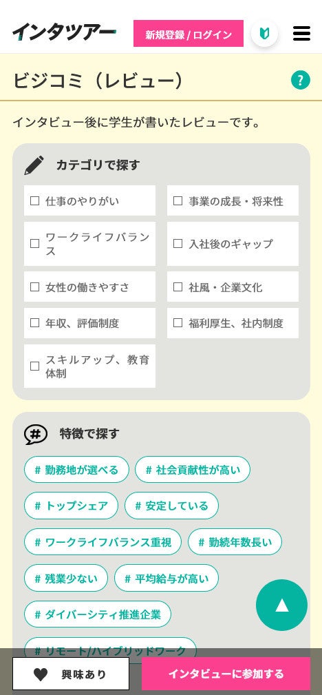 インタビュー開催日程に加え、特徴や業界など就活の軸となる項目から検索できるように機能を強化。ビジコミ(レビュー)も探しやすくなっています。