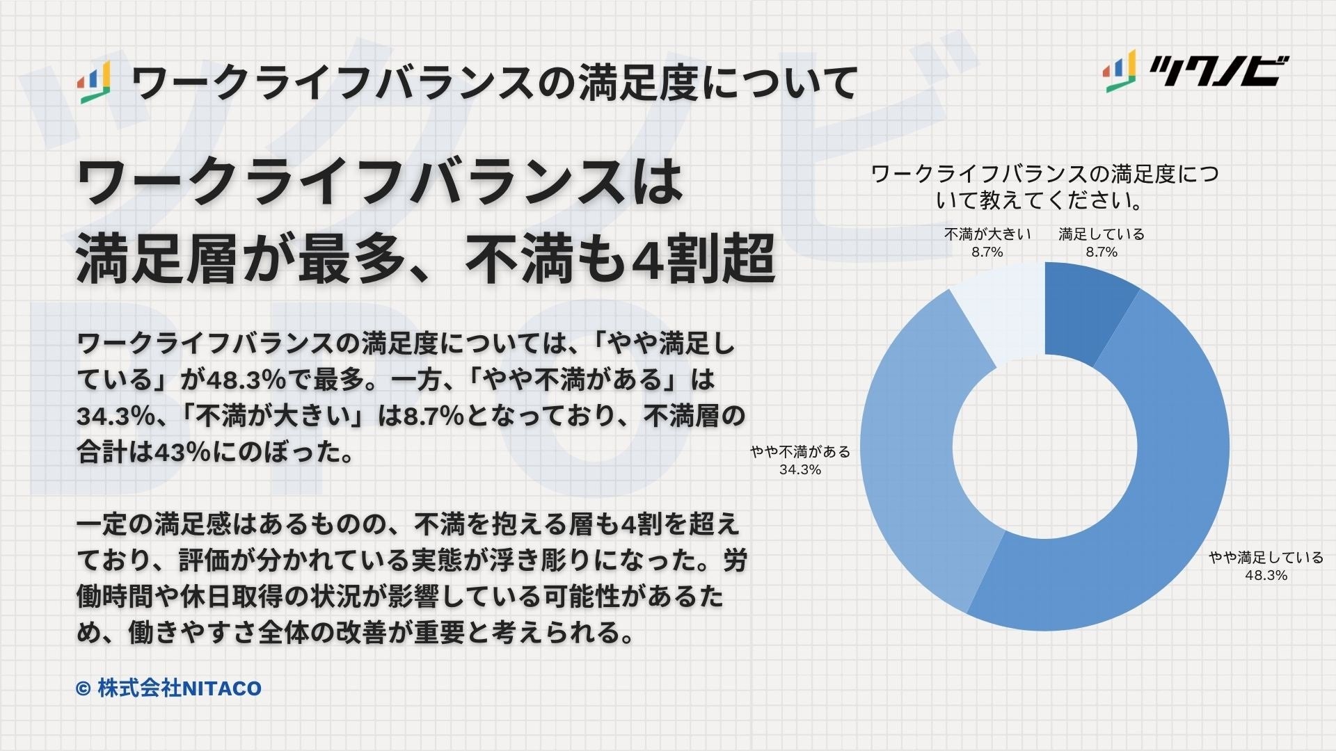 ワークライフバランスの満足度については、「やや満足している」が48.3%で最多でした。一方で、「やや不満がある」は34.3%、「不満が大きい」は8.7%となっており、不満層の合計は43%にのぼります。「満足している」は8.7%でした。