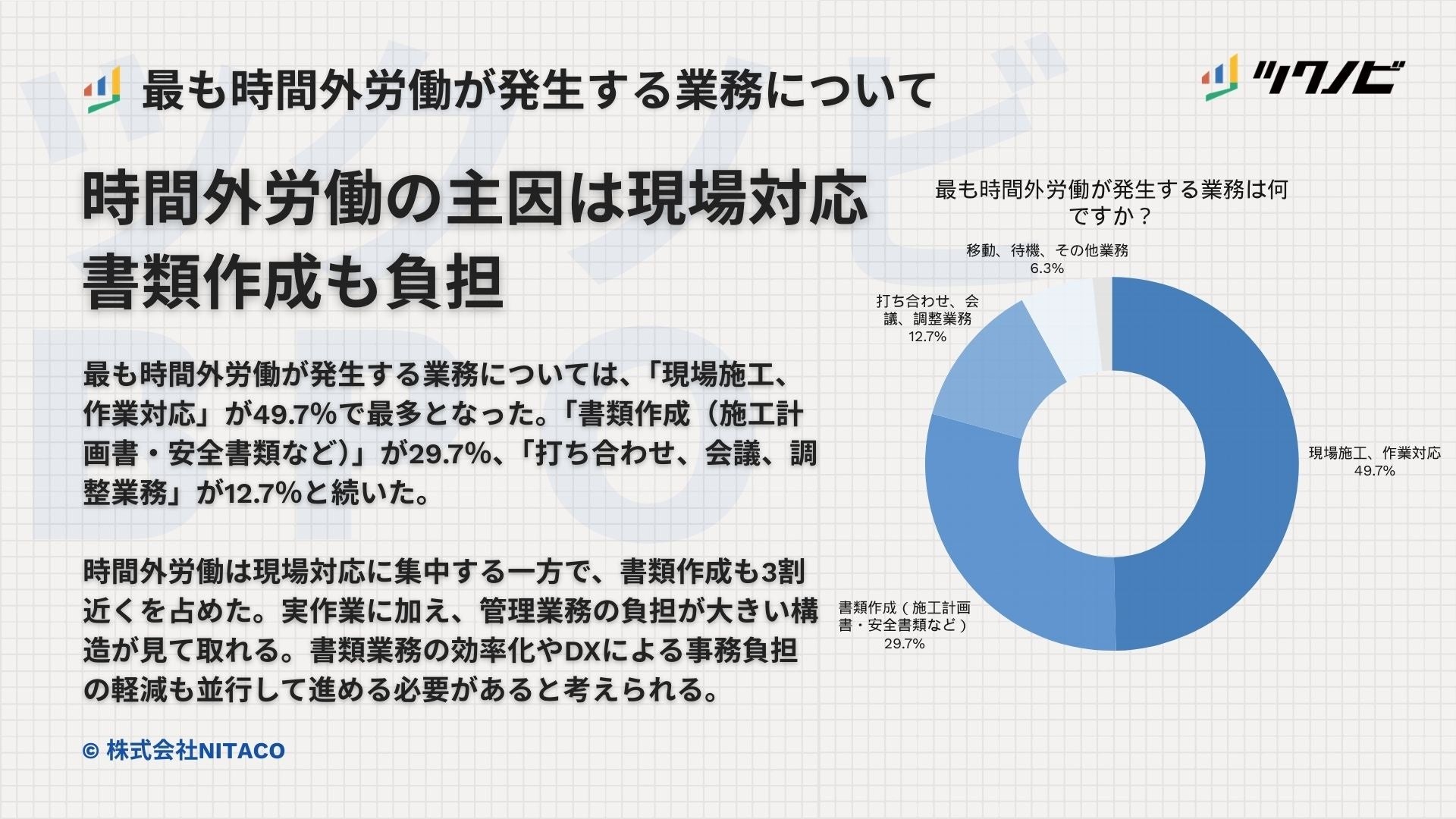 最も時間外労働が発生する業務は、「現場施工、作業対応」が49.7%で最多となりました。続いて「書類作成(施工計画書・安全書類など)」が29.7%、「打ち合わせ、会議、調整業務」が12.7%、「移動、待機、その他業務」が6.3%でした。