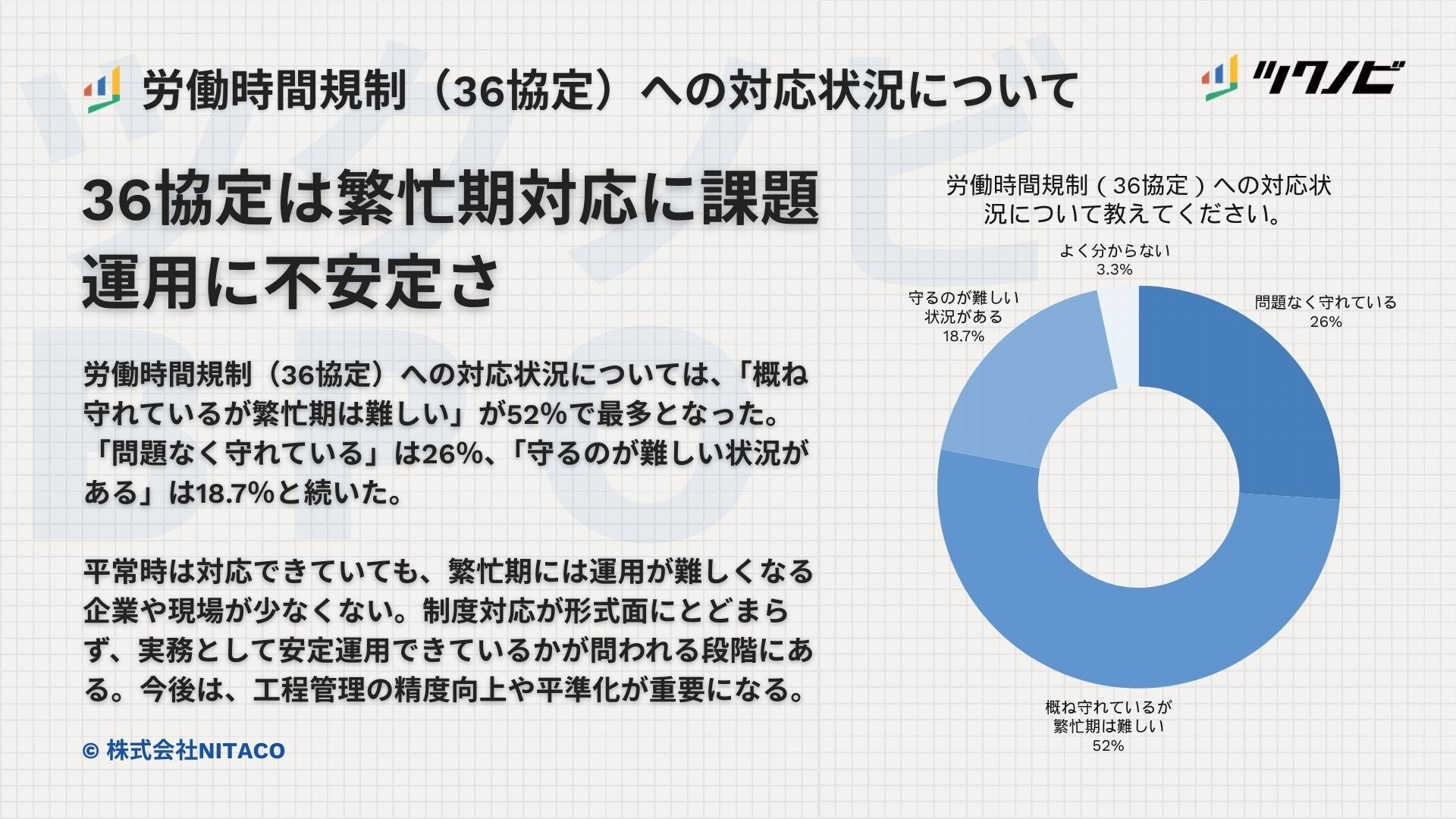 労働時間規制(36協定)への対応状況は、「概ね守れているが繁忙期は難しい」が52%で最も多くなりました。「問題なく守れている」は26%、「守るのが難しい状況がある」は18.7%、「よく分からない」は3.3%でした。