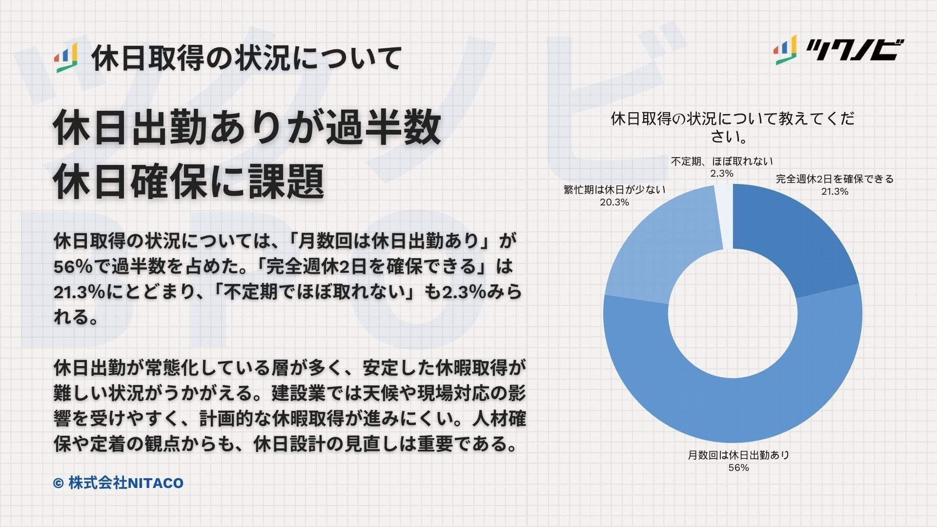 【建設業の時間外労働に関する調査】休日出勤ありが過半数、休日確保に課題