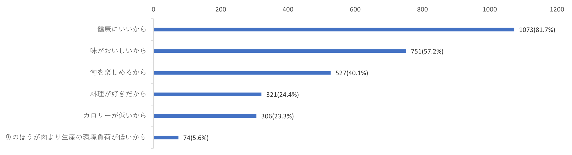 アンケートに回答いただいた1368人のうち、家で魚料理を作る頻度が週に1~3回以上という人が約7割を占めました。魚料理を作る理由として最も多いのが「健康にいいから」(81.7%)で、続いて「味がおいしいから」(57.2%)、「旬を楽しめるから」(40.1%)でした。