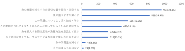「世界的に魚の獲りすぎなどにより、水産資源が減少の危機にあることを知っていますか?」という質問に対しては、「知っているし、関心がある」が56.1%、「知らなかったが、関心はある」が38.2%と、合わせて94.3%が関心を持っていました。水産資源の減少をどうすれば防げるかという問いへの回答で最も多かったのが「魚の廃棄を減らすため適切な量を販売・消費する」(70.4%)、続いて「魚の獲りすぎを減らす」(59.9%)でした。