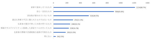 「魚介類を選ぶ際に、多少値段が高くても選びたいと思うもの」は、「新鮮で美味しそうなもの」(88.7%)、「安心・安全なもの」(65.8%)、「添加物が使われていないもの」(38.5%)など、水産物の状態に関する回答が多くを占めましたが、「違法な漁業で不正に獲られたものではないもの」(21.3%)、「生産者の思いや理念に共感が持てるもの」(18.1%)、「環境やサステナビリティに配慮した認証ラベルがついたもの」(16.7%)といった生産方法に関する回答も一定数ありました。