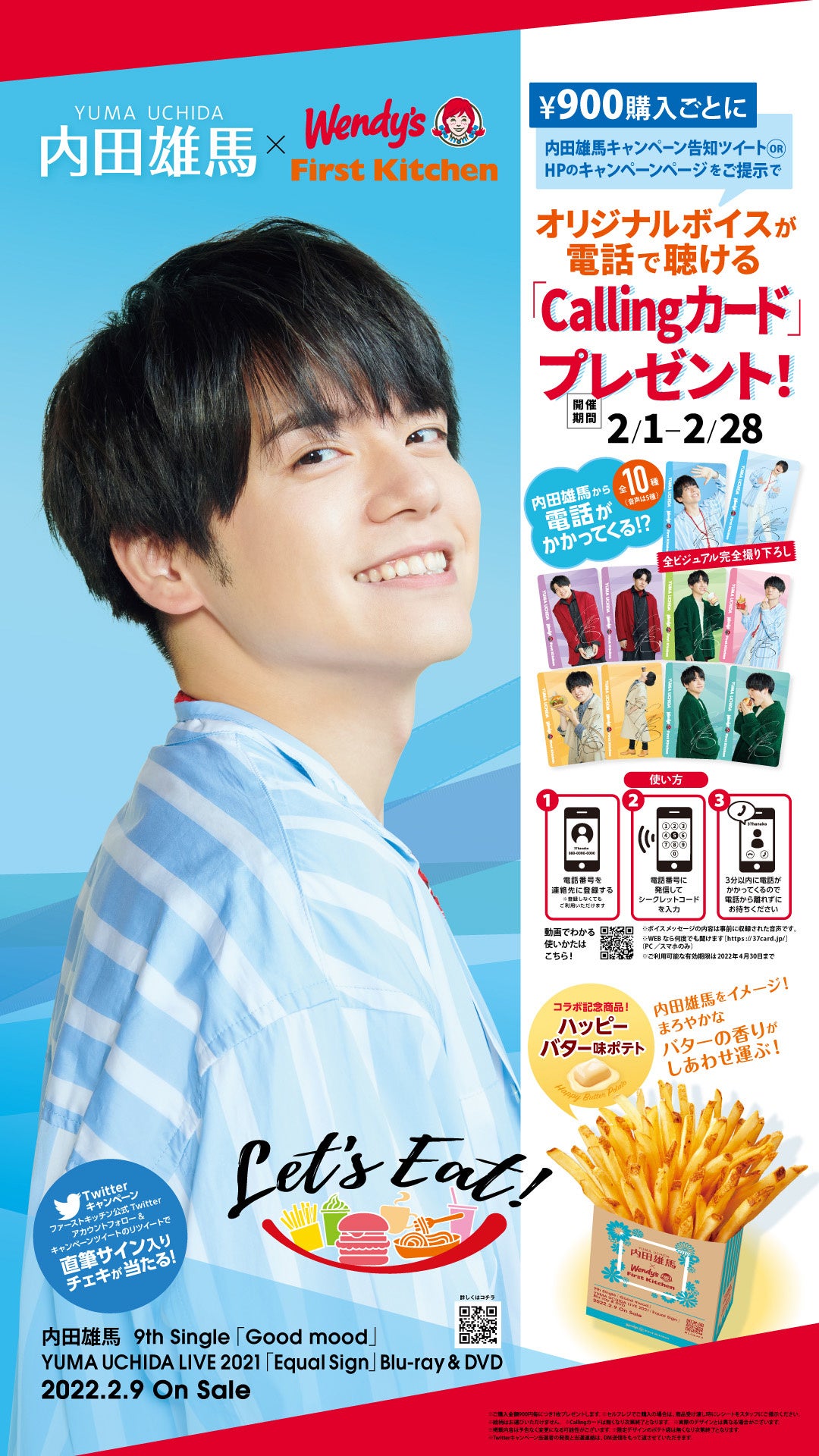 ファーストキッチン株式会社(代表取締役:紫関修 所在地:東京都新宿区)では2月1日(火)より、ウェンディーズ・ファーストキッチン店舗ならびにファーストキッチン店舗にて、若手声優で音楽活動など幅広い活動を行っている内田雄馬さんとのコラボキャンペーンを開催いたします。 900円毎のご購入の際、キャンペーン告知ツイート or 当社HPのキャンペーンページを提示すると、内田雄馬さんオリジナル 『Cαllingカード(ボイス付きカード)』がもらえるプレゼントキャンペーンを開催。またコラボ開催を記 念して、内田雄馬さんをイメージしたフレーバーポテト、「ハッピーバター味ポテト」を期間限定販売します。 さらに期間中「渋谷センター街店」「池袋北口店」「梅田芝田町店」にて内田雄馬さんの特別装飾を実施!!ここでしか見られない内田雄馬さんの完全撮りおろしフォトパネルが皆様をお迎えいたします。ご来店をお待ちいたしております。