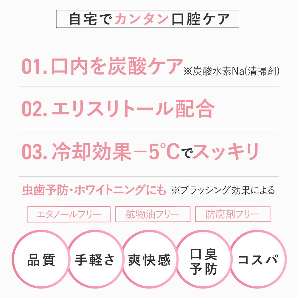 毎日の歯磨きをより効果的に!-5℃の冷却効果で歯茎をキュッと引き締め、炭酸ケア。口内すみずみに行き渡り、口臭の元になる渇きやネバつきをスッキリ除去します。