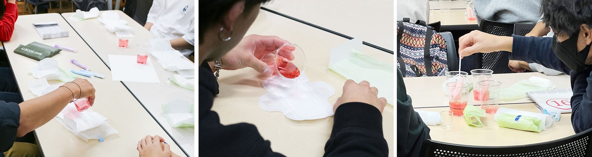 ナプキンやタンポンなどの生理用品、また、吸水ショーツも実際に手に取っていただきながらご紹介。男子学生たちは初めて手に取るナプキンやタンポンの扱い方に戸惑いながらも、真剣に吸水実験に取り組んでいる様子でした。またタンポンを、実際に見たことも触ったこともないという女子学生もいる中、「ナプキンやタンポンそれぞれの良さがあると知ったので使い分けられると便利かもしれない。今後指導者になった時に多くの選択肢があり自分に合ったものを選ぶ大切さも伝えていきたい」という意見もありました。