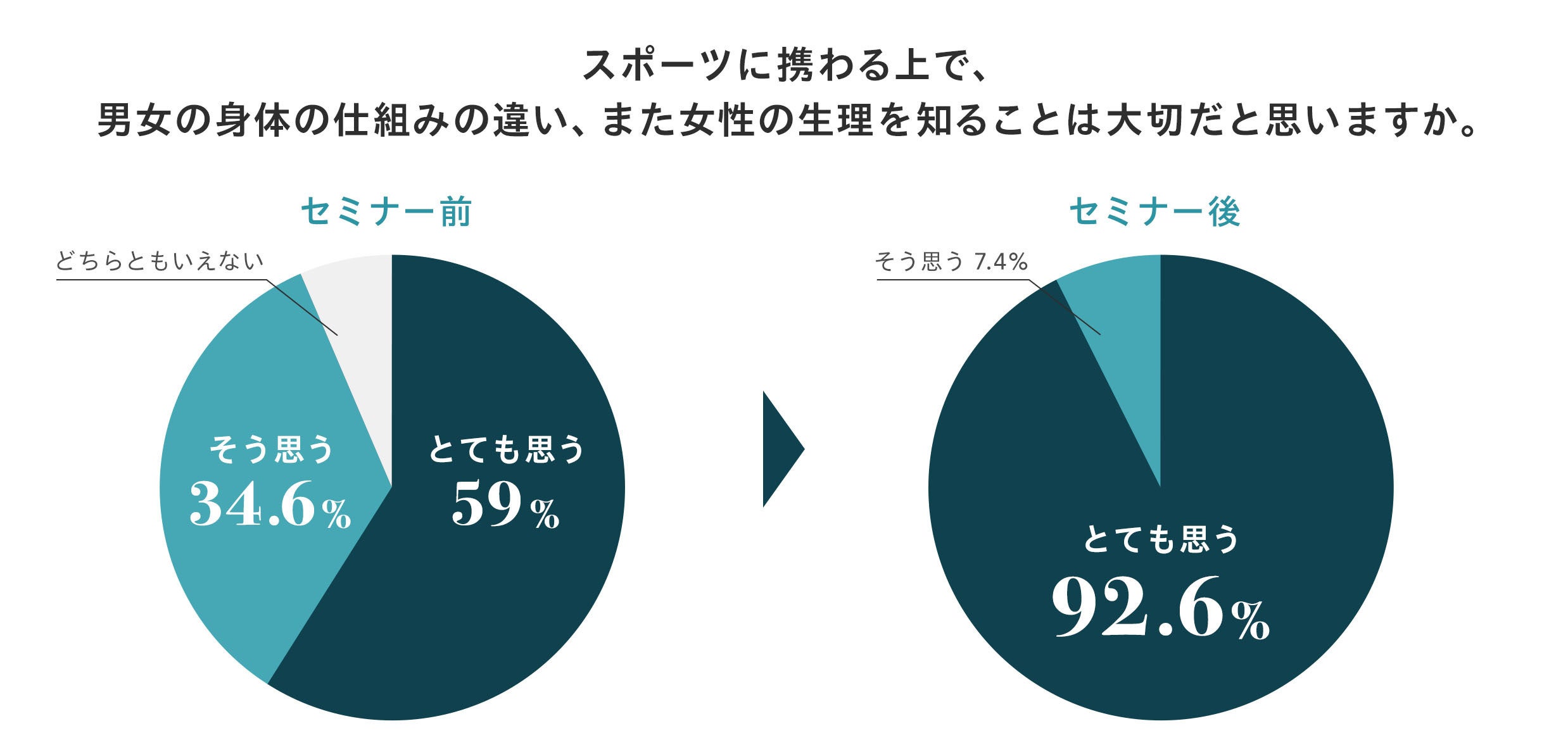 『スポーツに携わる上で、男女の身体の仕組みの違い、また女性の生理を知ることは大切だと思いますか』という質問に対しては、セミナー実施前“とても思う”が59%に対し、セミナー実施後は92.6%にまで増え、“そう思う”という回答者を含めると100%の学生が『大切である』と回答しました。