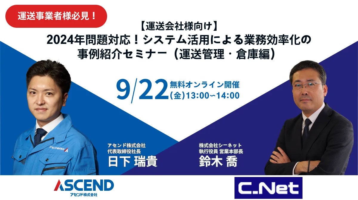 シーネット、アセンド共催セミナーを9/22オンラインで開催【運送会社様向け】2024年問題対応!