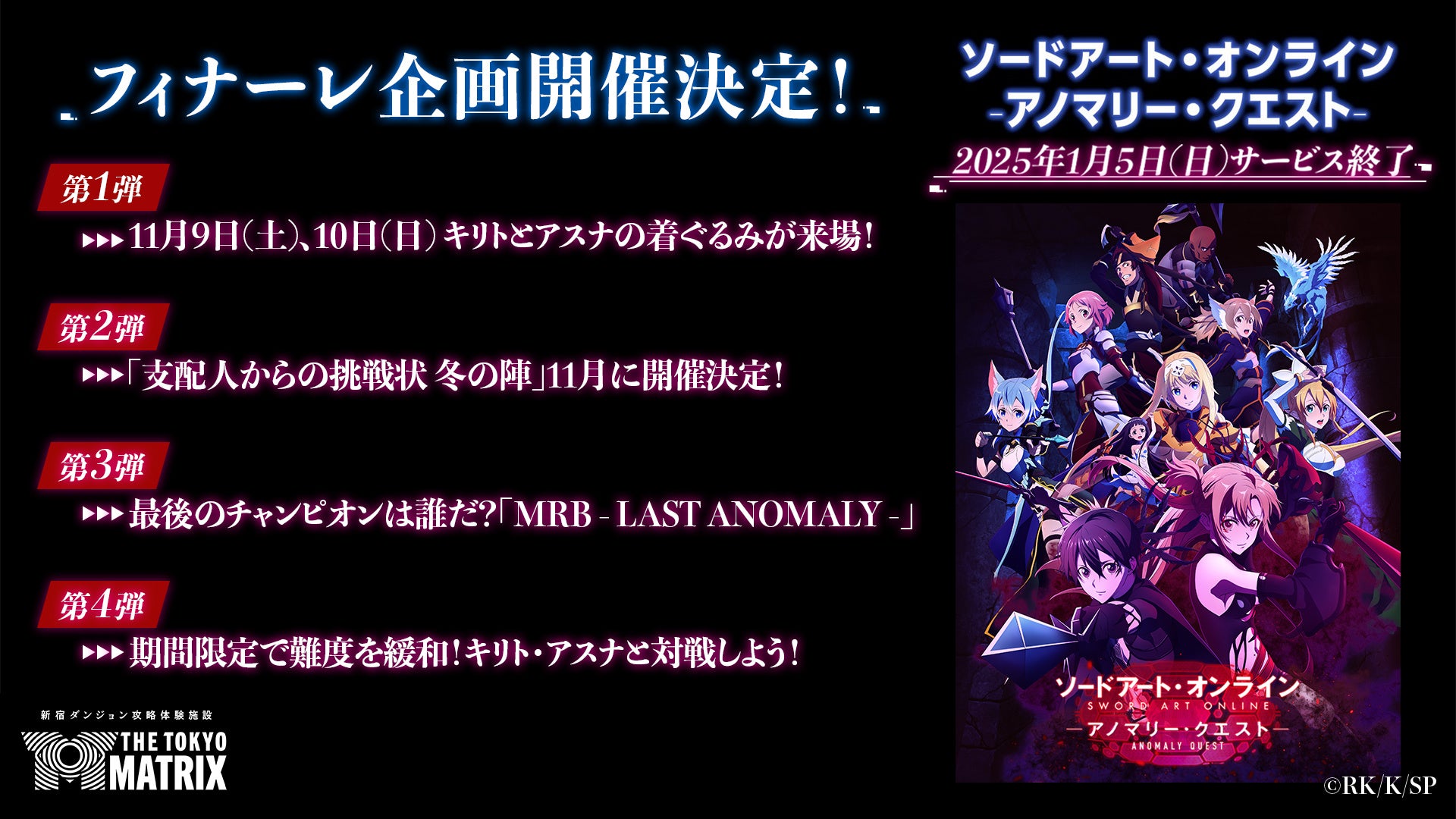 サービス終了までの期間、今夏好評を頂いた「支配人からの挑戦状」や、ランキングバトル「MATRIX Rank Battle」の最終回など、様々な「ソードアート・オンライン -アノマリー・クエスト-」のフィナーレ企画をお届けいたします。