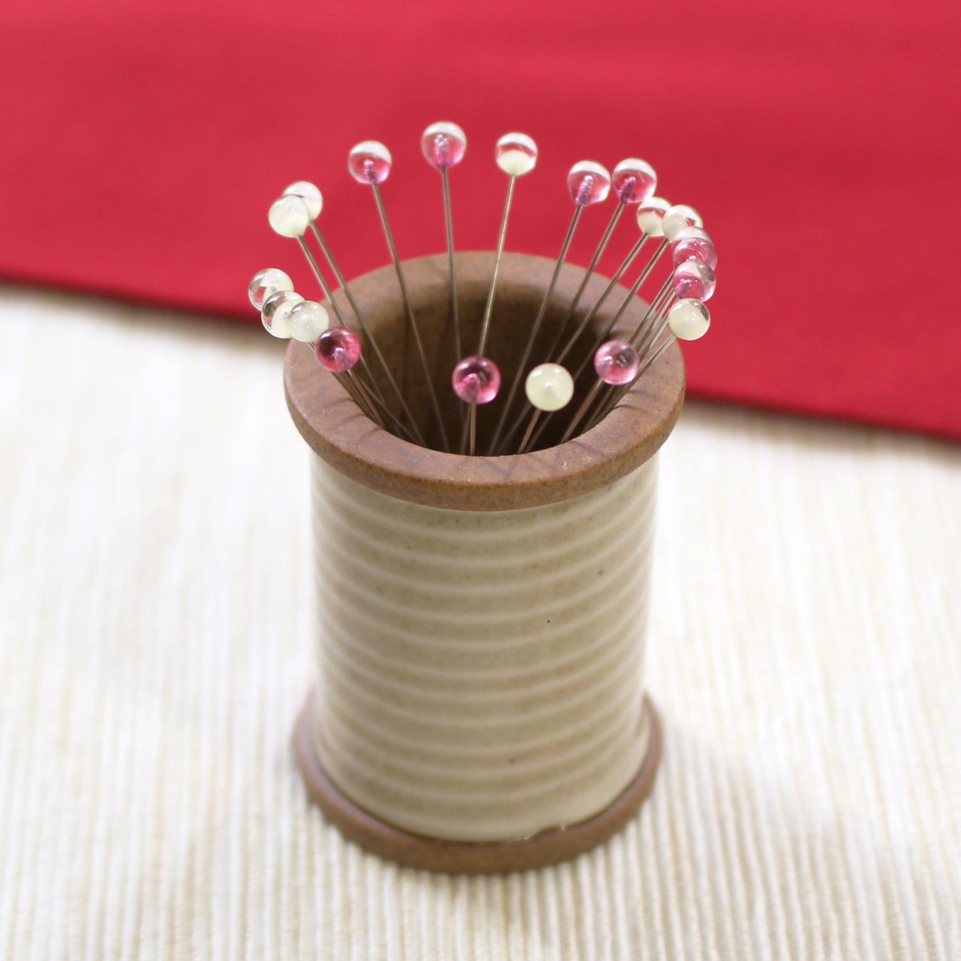 波佐見焼のスプール(糸巻き)モチーフのマグネットピンクッションに、寒椿色とアイボリーの2色の待針をセットしました。