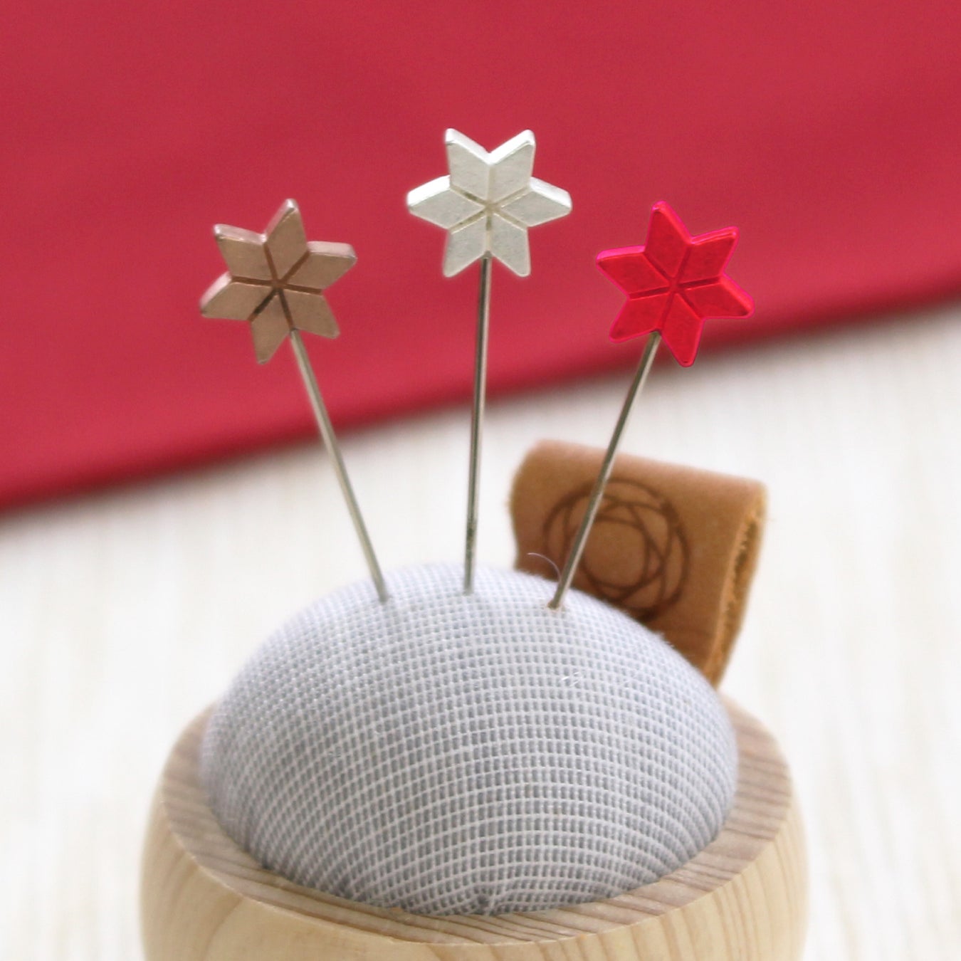 夜空に光る美しい星たちをイメージしてつくられた待針です。カラーは落ち着いた寒椿色・銅・銀の3色。