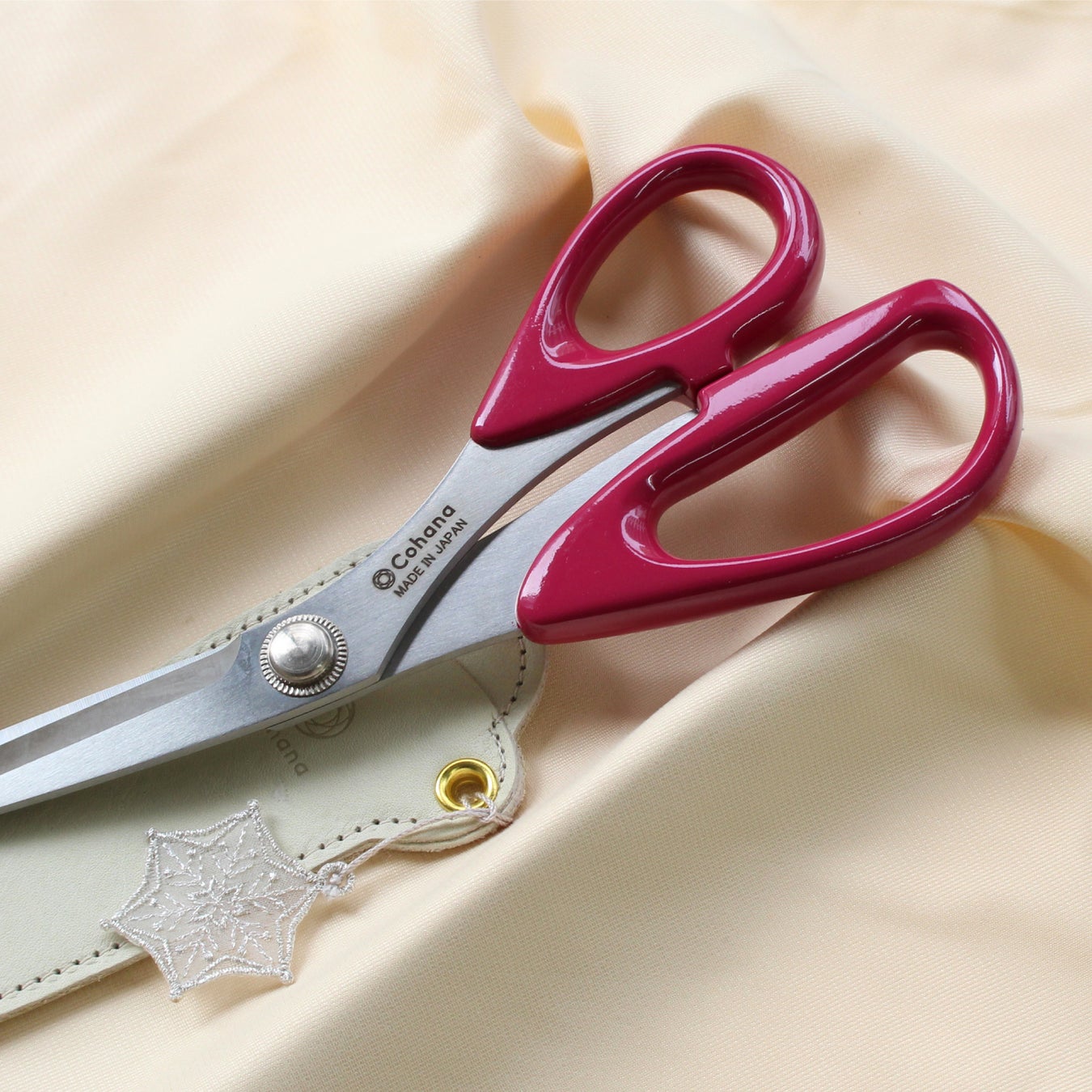 裁ちばさみとしては少し小ぶりのサイズ感。女性の手にフィットし、扱いやすく、軽いので長時間使用しても疲れません。ハンドルは一つひとつ職人の手により艶やかに仕上げられた限定カラーの漆塗り。ケースには、雪の結晶のチャームがきらめきます。漆独特のなめらかな質感で使うほどに愛着が増す、特別なはさみです。