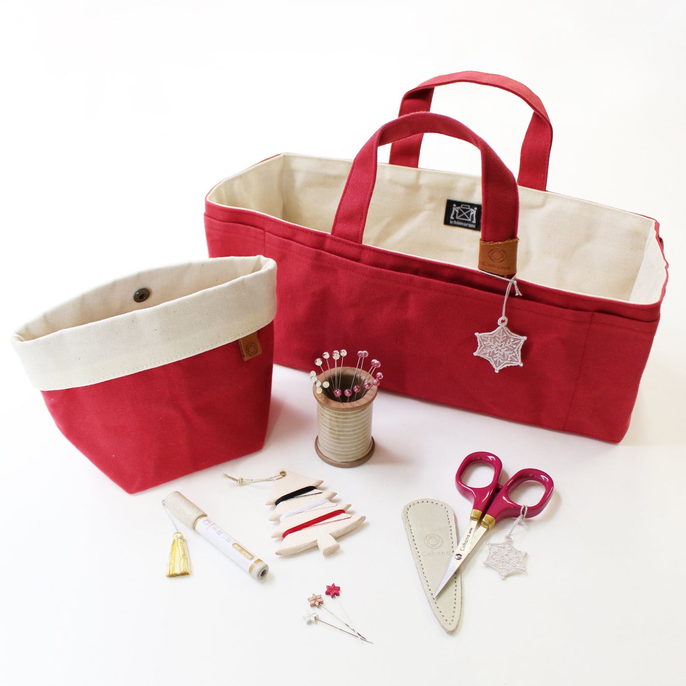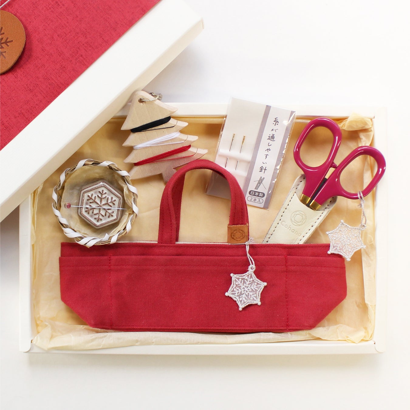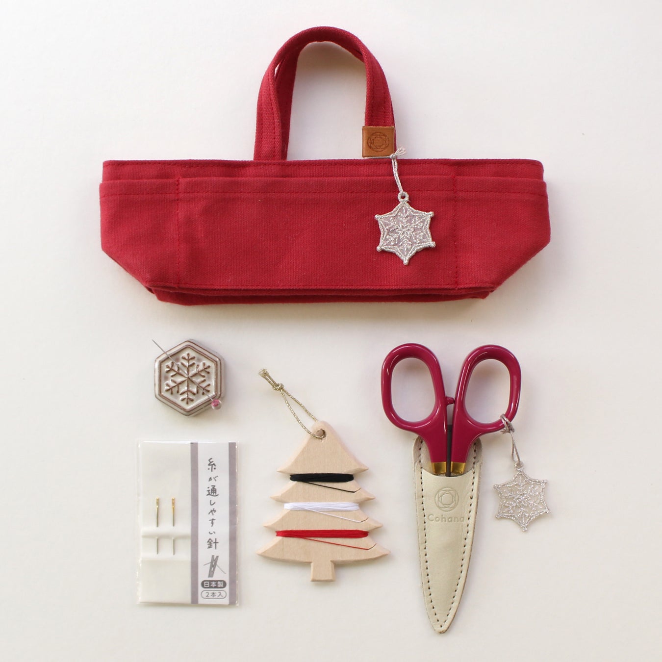 ・セット内容:帆布の道具入れ/帆布の小間物ポーチ/漆と金蒔絵の小ばさみ 寒椿/星の待針 寒椿/波佐見焼のスプールと待針セット 寒椿/手縫い針セット/クリスマスツリー糸巻き