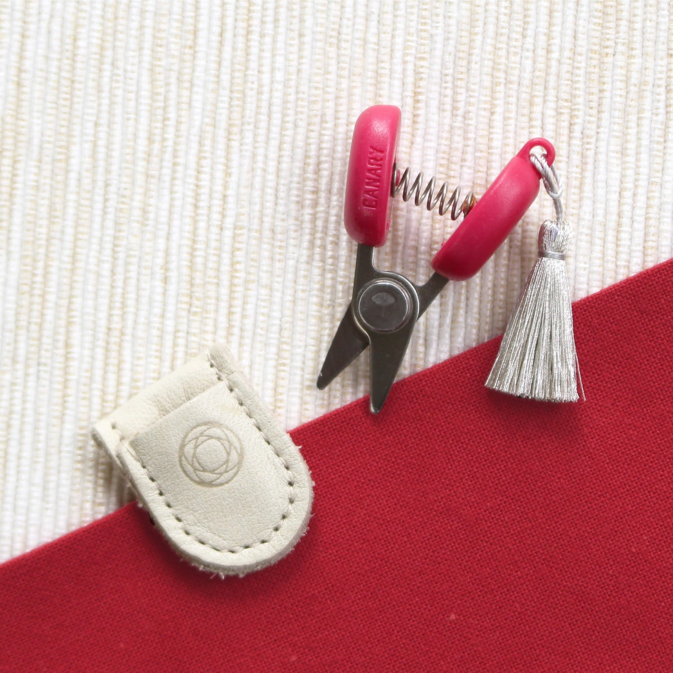 寒椿色の豆ばさみの持ち手に白銀のタッセルがきらりと輝き、はさみケースには、限定カラーの上質な本革を使用しています。