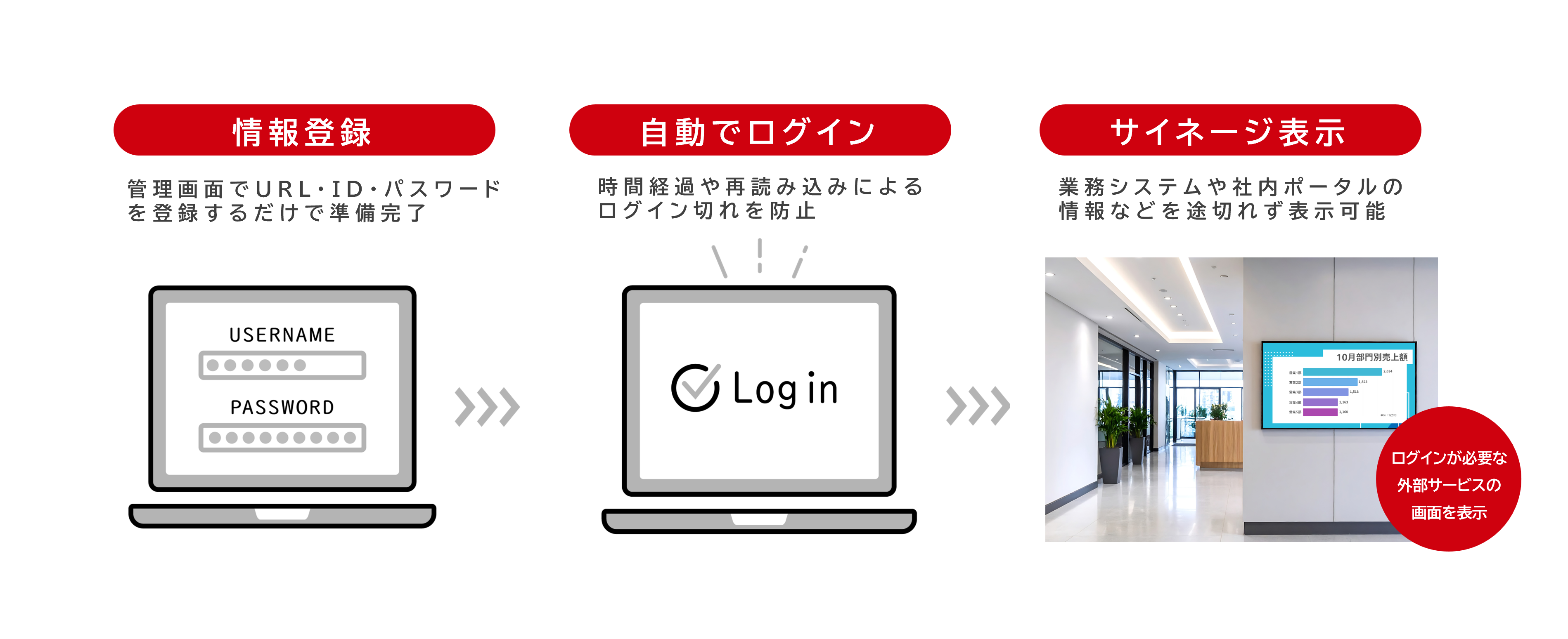 本機能により、ログインが必要な社内ポータルや業務ダッシュボードを自動で表示できるようになり、オフィスサイネージの活用範囲が広がります。