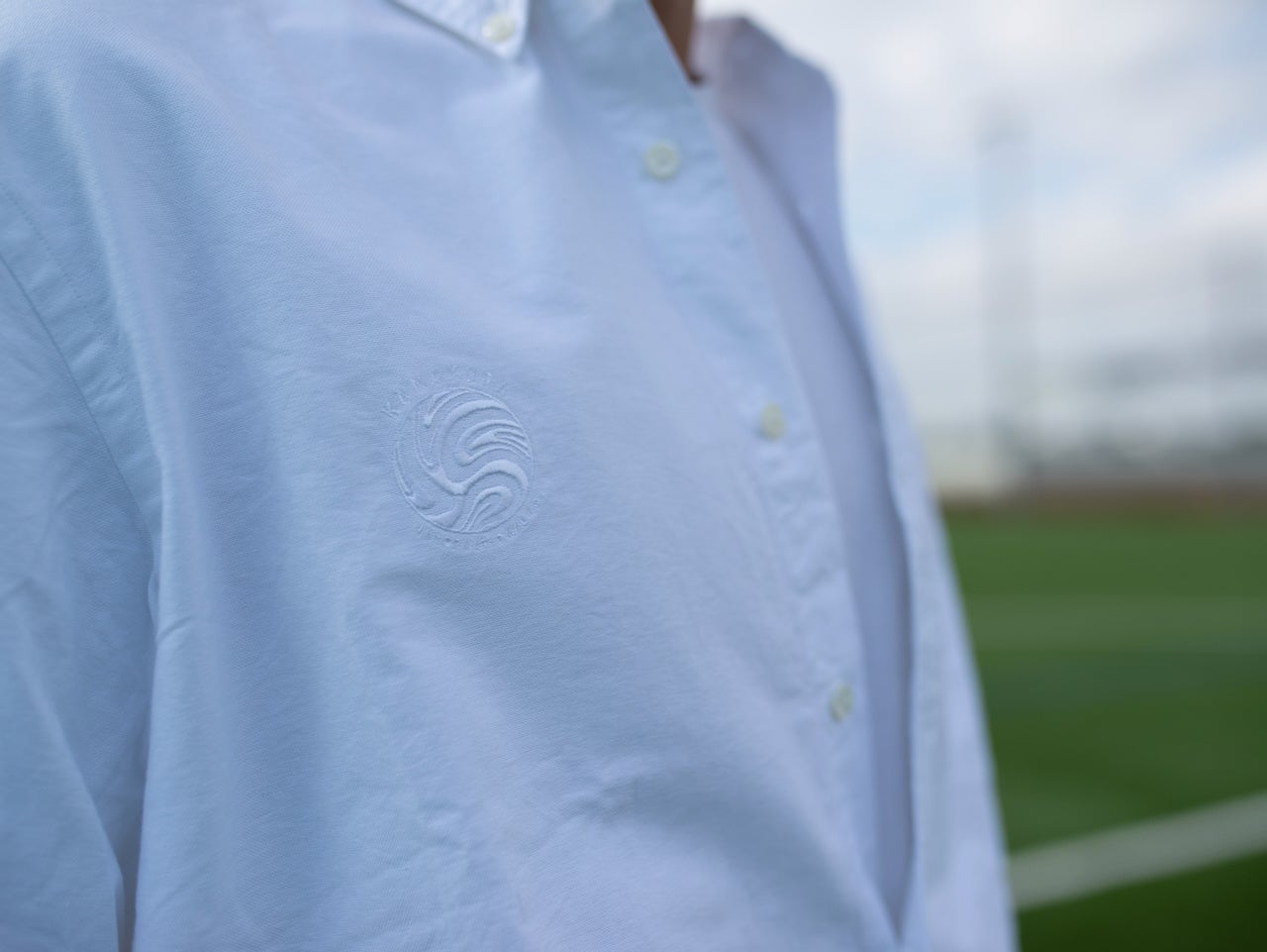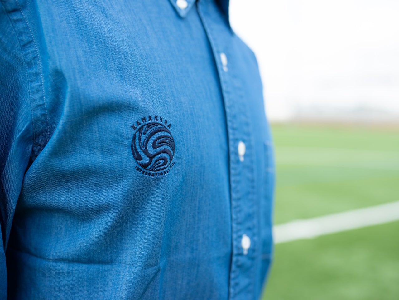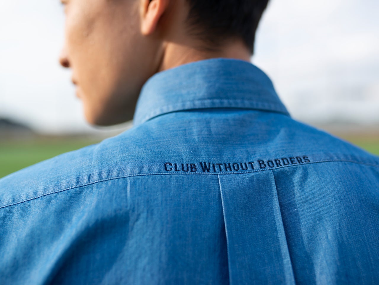 メーカーズシャツ鎌倉のオックスフォードシャツとカイハラデニムシャツに鎌倉インテルのクラブロゴとクラブビジョンである「CLUB WITHOUT BORDERS」を刺繍。