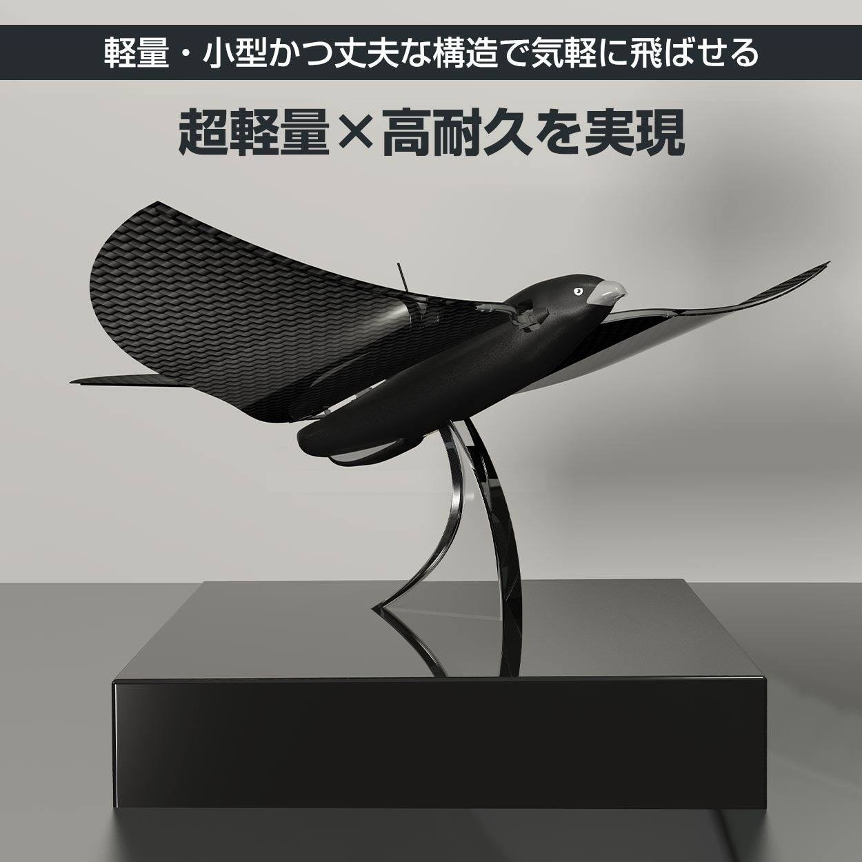 自然の生物の機能を模したバイオミティクス(生物模倣)と呼ばれる考え方に基づき開発され、柔軟性のあるプラスチックを使った本体はたった9.5g=100円玉たった2枚分しかありません。約150m範囲で通信可能でアルミラジエーターを備えたメインモーターは、機械的なノイズがほとんど聞こえず飛んでいる姿は本物の鳥と全く同じように見えます。