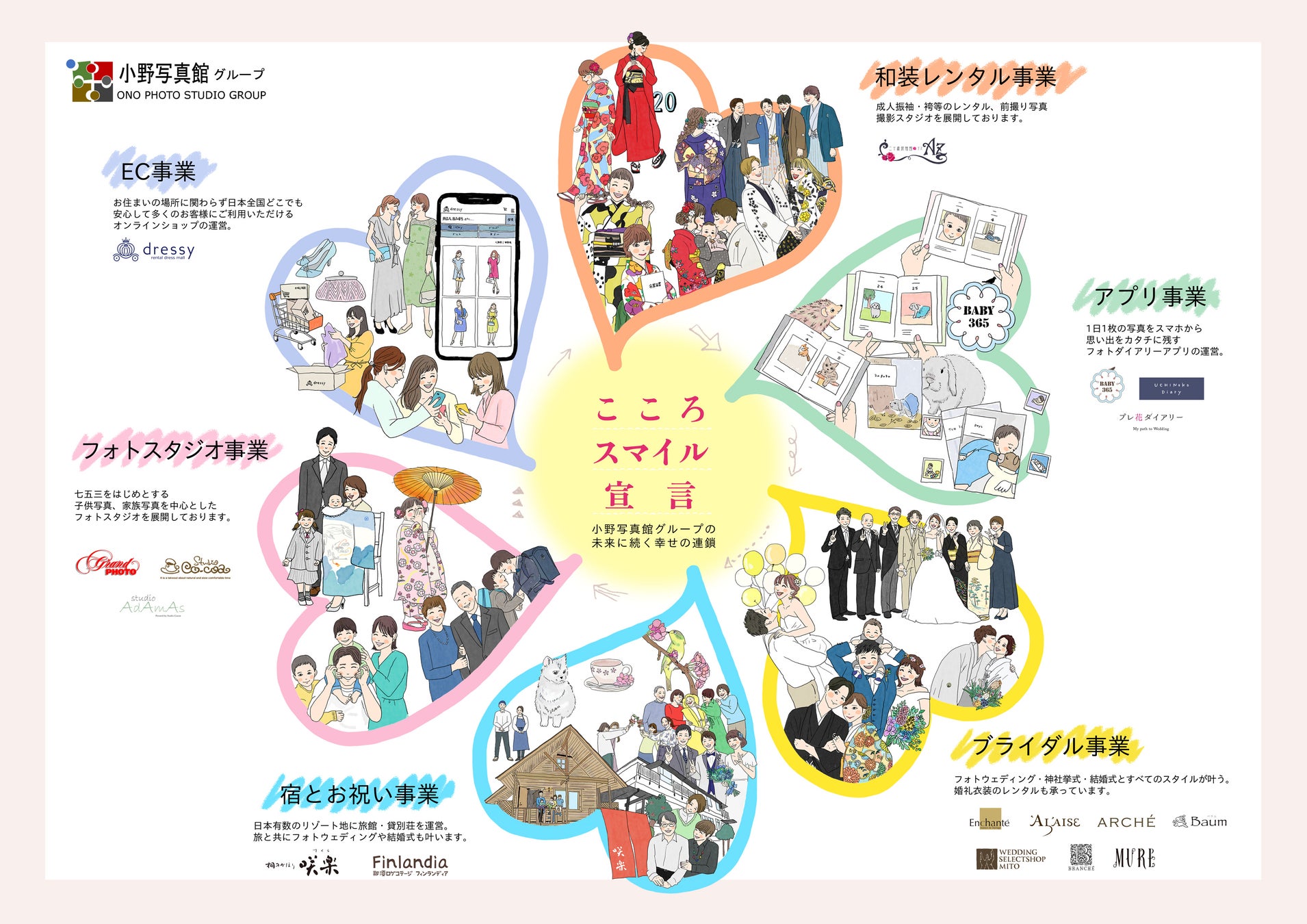 私たち株式会社小野写真館は、今後も経営理念でもあります「世界に笑顔、幸せ、感動を連鎖させる」ことを実現するために、時流に乗った事業・サービスを展開し豊かな社会を創り出すことを目指してまいります。